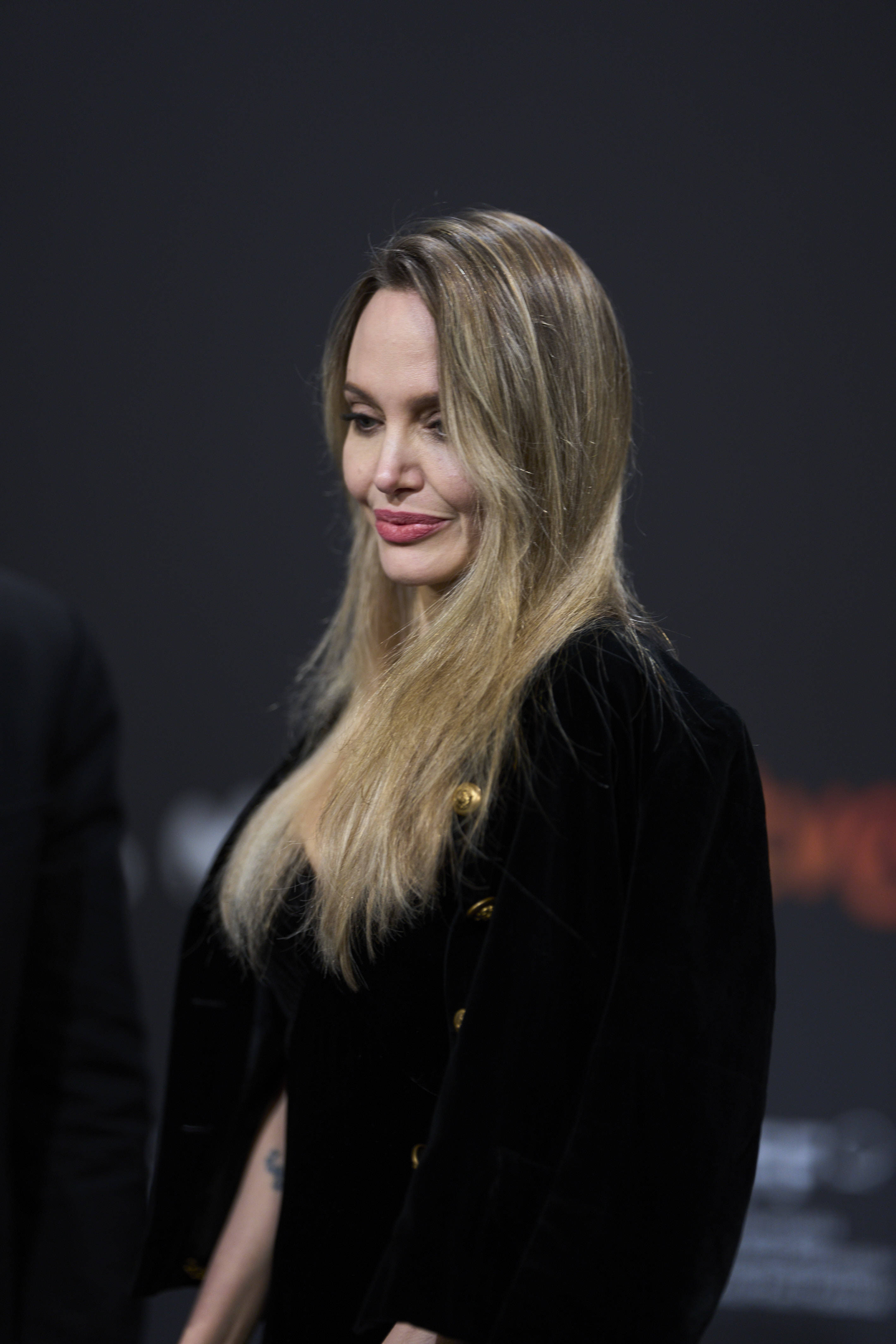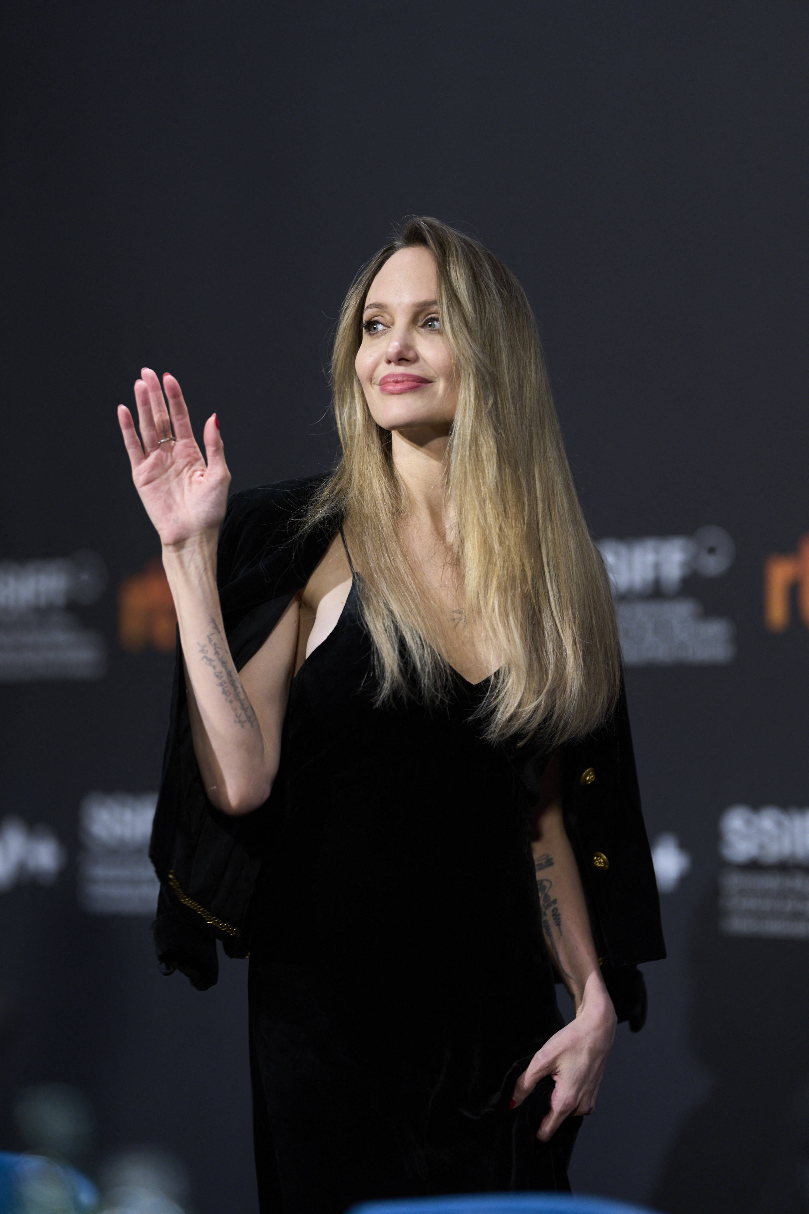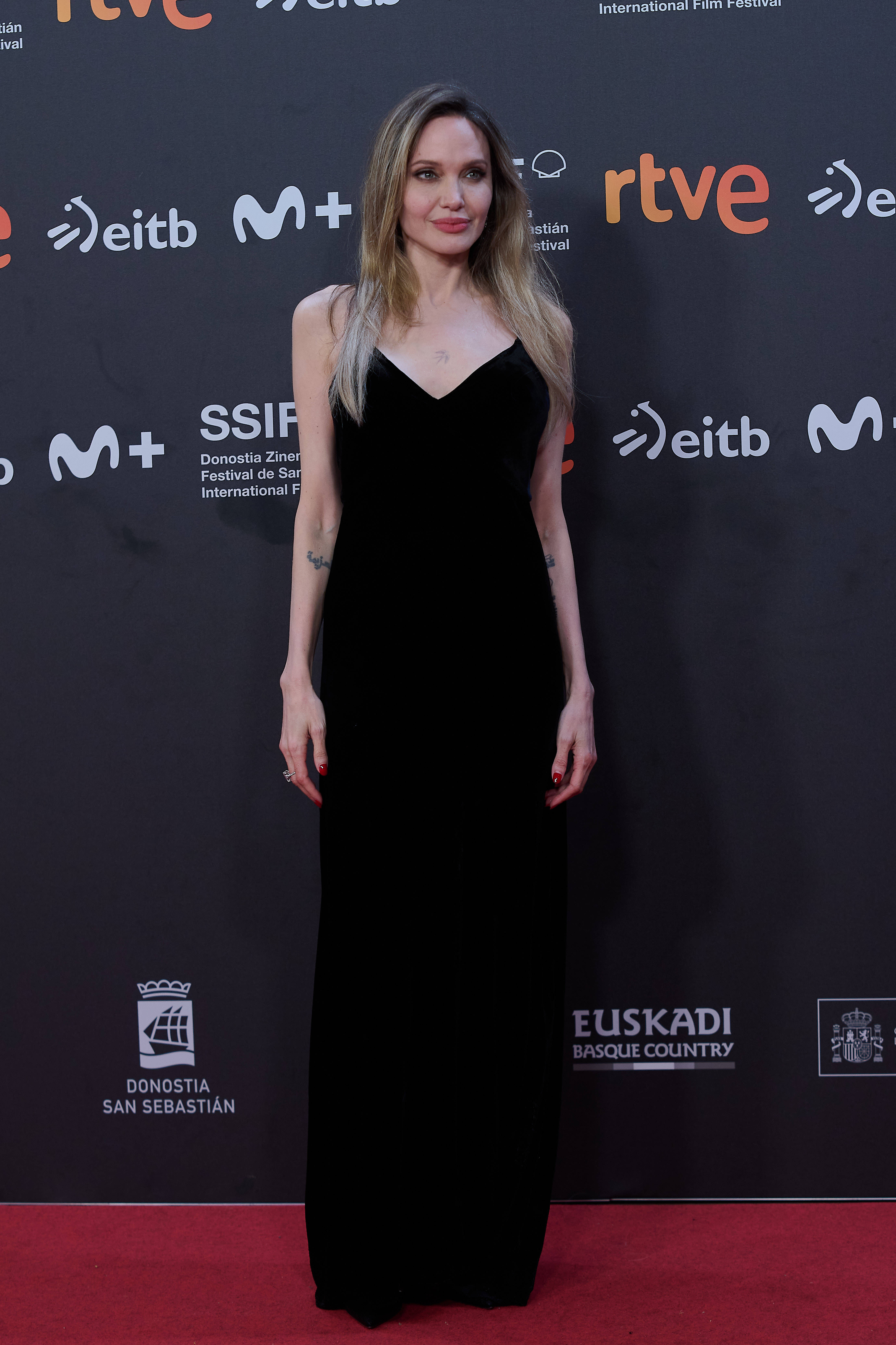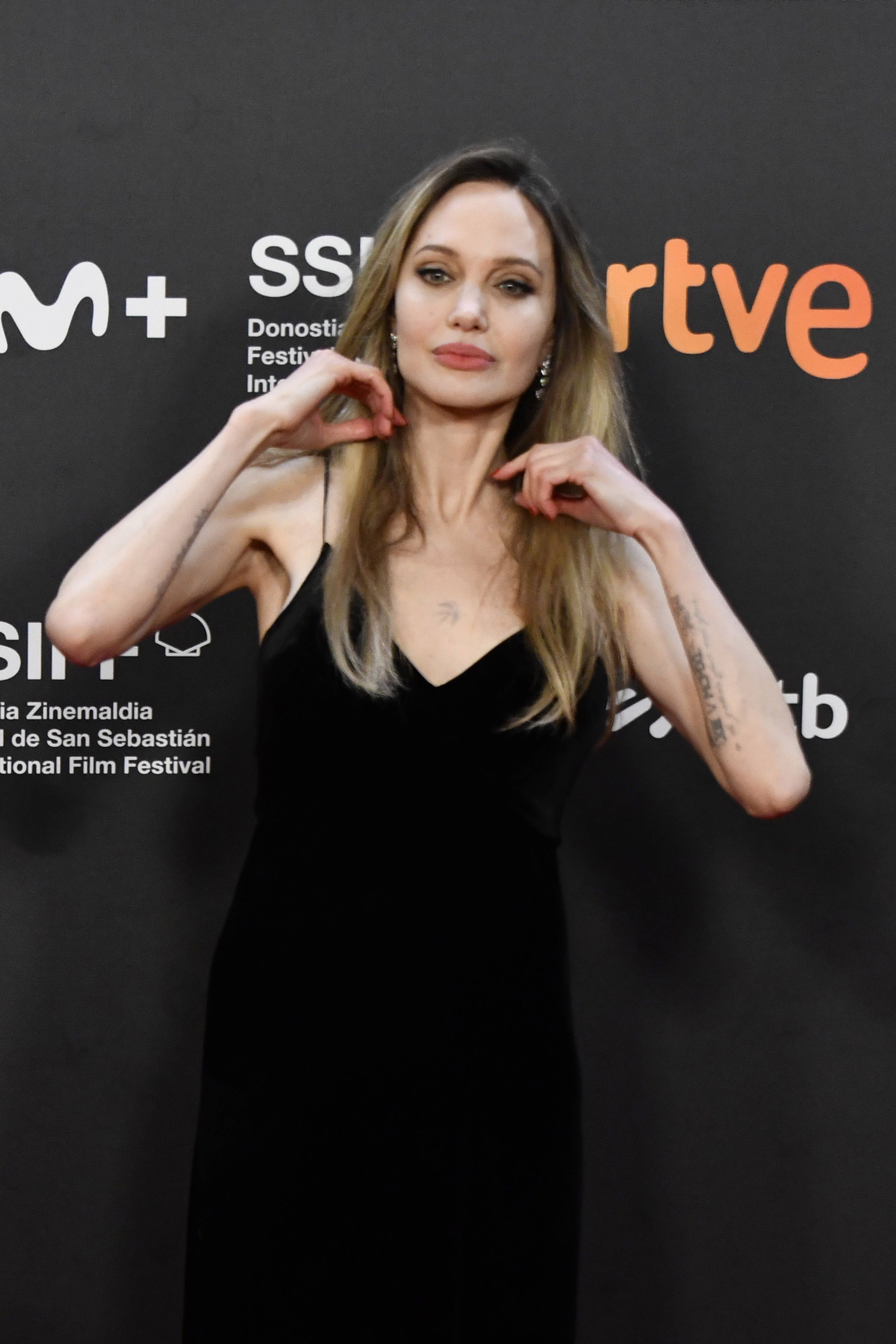 Angelina Jolie a atras toate privirile într-o rochie neagră cu decolteu adânc, în timp ce poza pe covorul roșu, la evenimentul Couture de la Festivalul de Film de la San Sebastián, din Spania, duminică.
