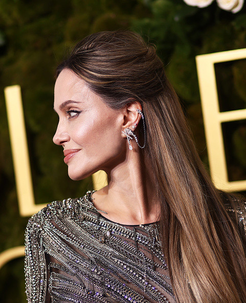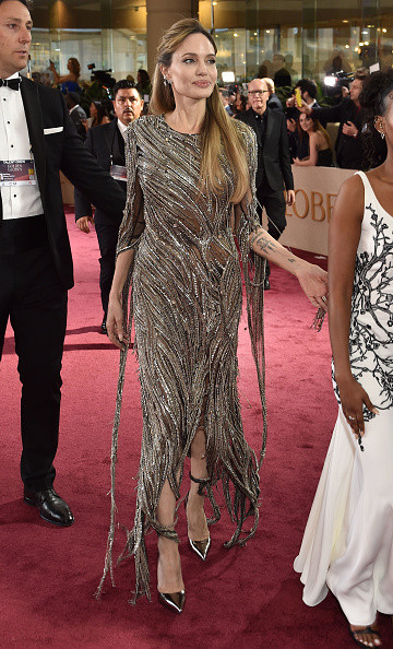 Angelina a completat look-ul special al serii cu o pereche de pantofi cu toc aurii, strălucitori. Părul lung i-a fost prins parțial la spate, lăsând șuvițele să-i cadă lejer pe umeri în valuri ușoare.