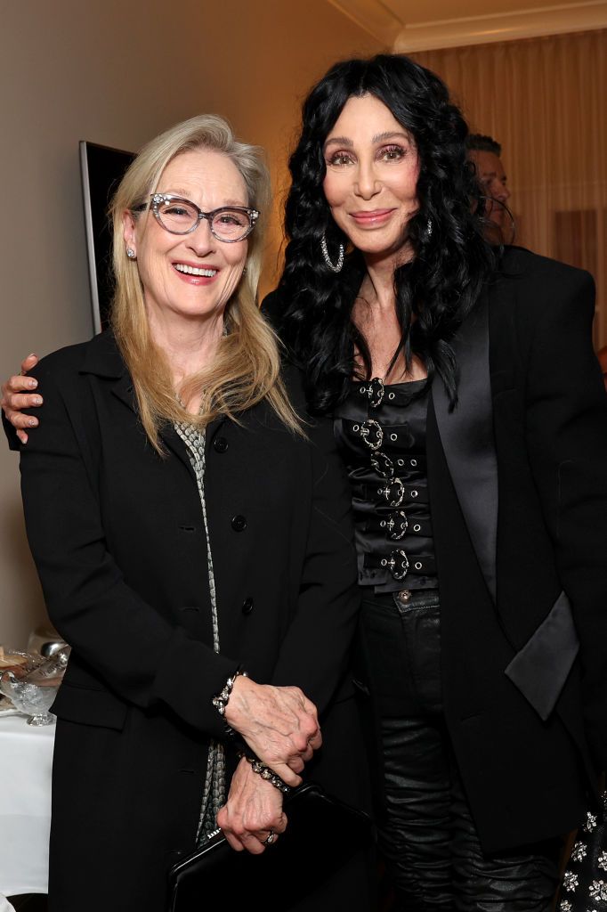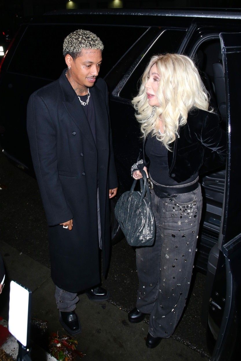 Pentru petrecere, Cher a purtat o pereche de blugi gri cu paiete și un top negru fără umeri pentru ieșire, accesorizându-se cu o singură mănușă din paiete argintii și bijuterii asortate.