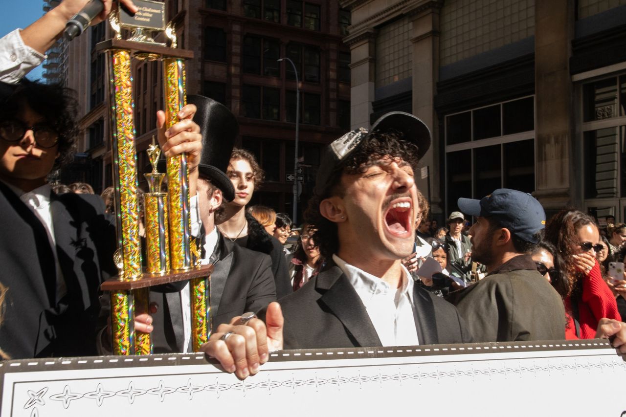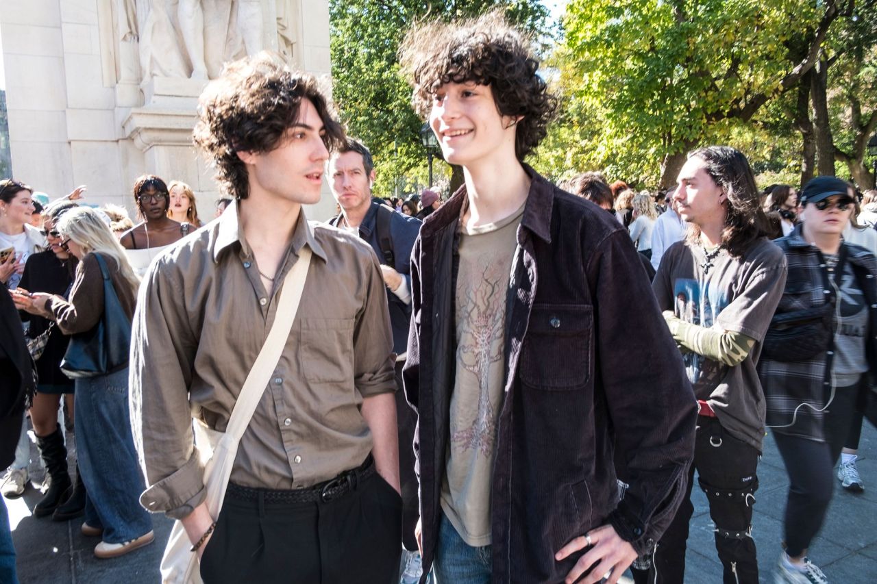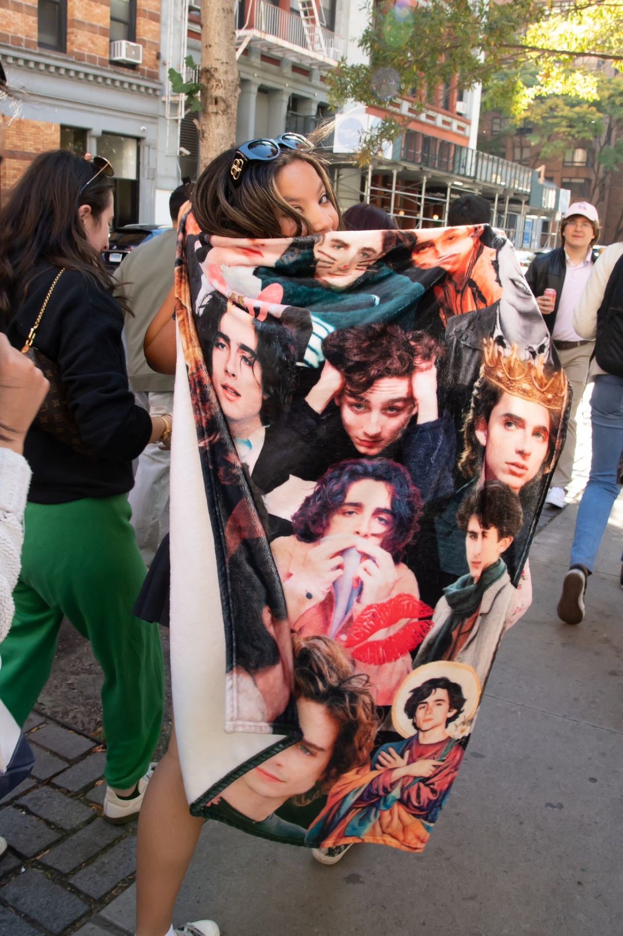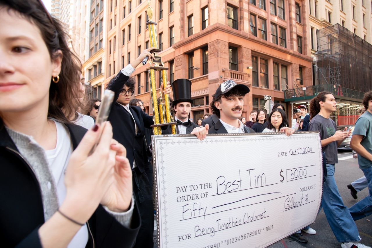 Timothée Chalamet şi-a făcut loc prin mulţime, ascunzându-se în spatele unei măşti negre şi a unei şepci de baseball, înainte de a se îndrepta spre două sosii ale sale, care pozau pentru fotografi. Actorul şi-a scos masca, stârnind ţipete printre fani, care s-au făcut auzite în tot parcul, potrivit Variety.
