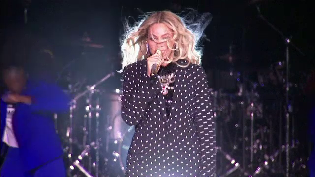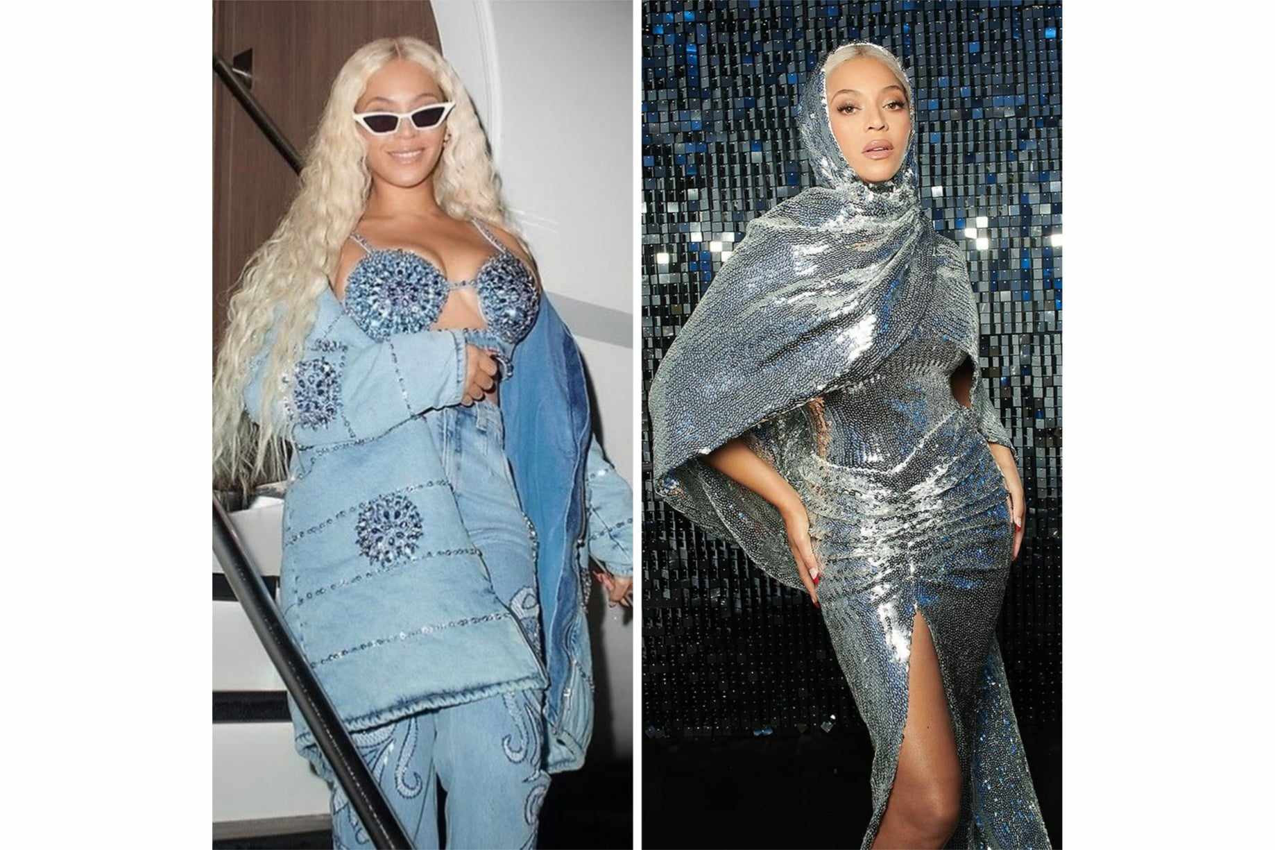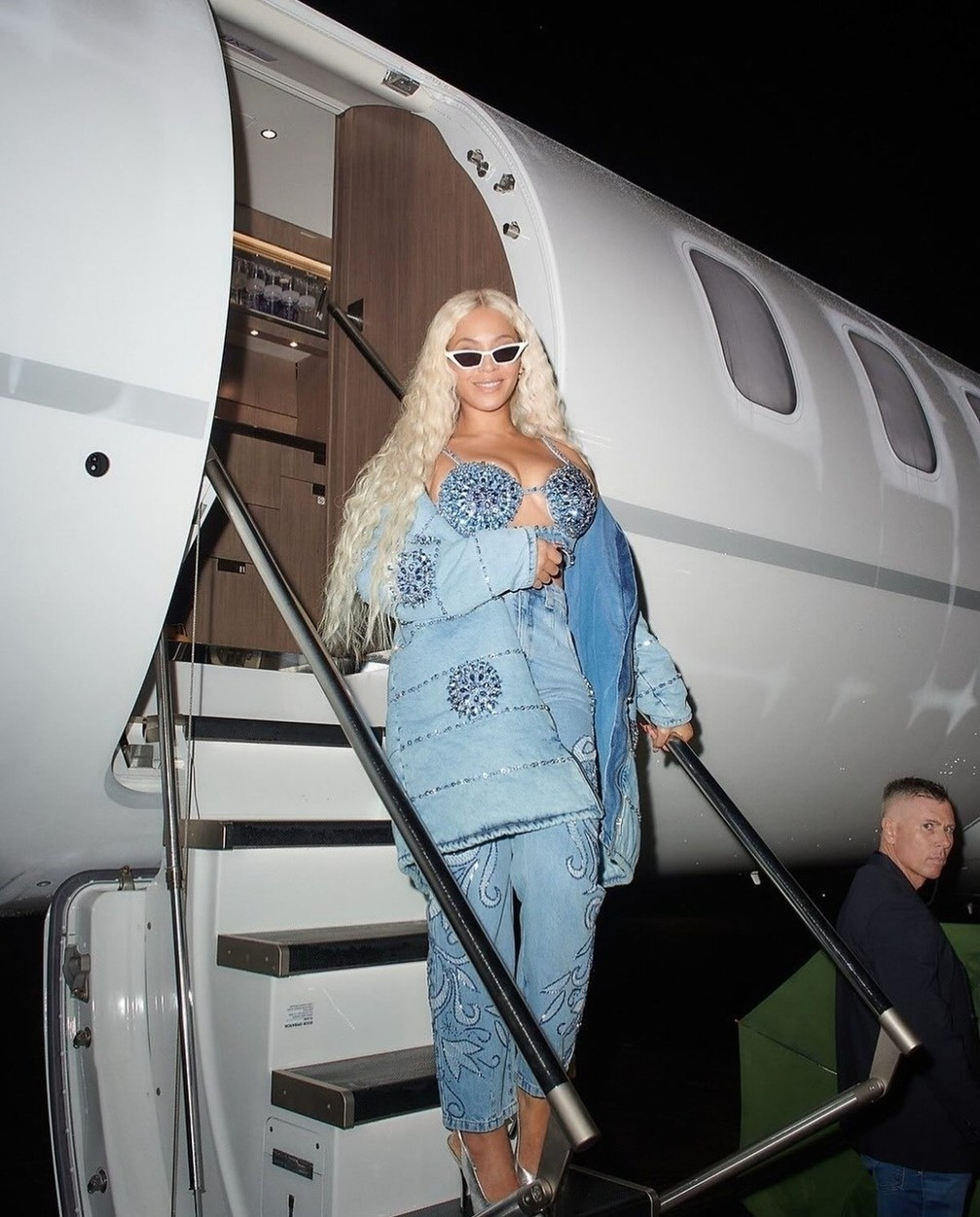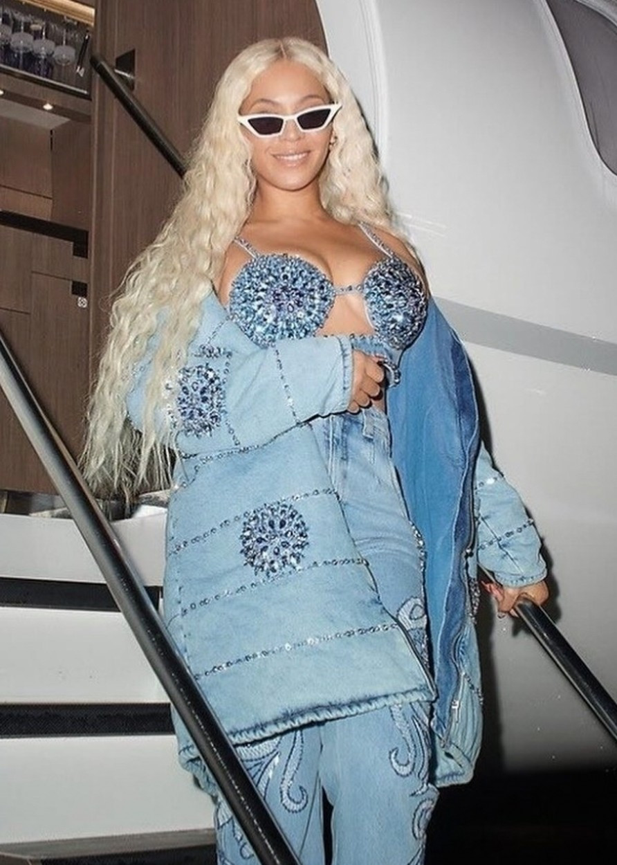 Beyonce a ales să poarte o ținută nonconformistă, din denim: o pereche de blugi cu talie înaltă, cu un model din paiete, și o geacă asortată. Piesa de rezistență a ținutei a fost sutienul albastru, bătut cu pietre prețioase. Vedeta a accesorizat totul cu o pereche de pantofi argintii și o pereche de ochelari de soare albi.