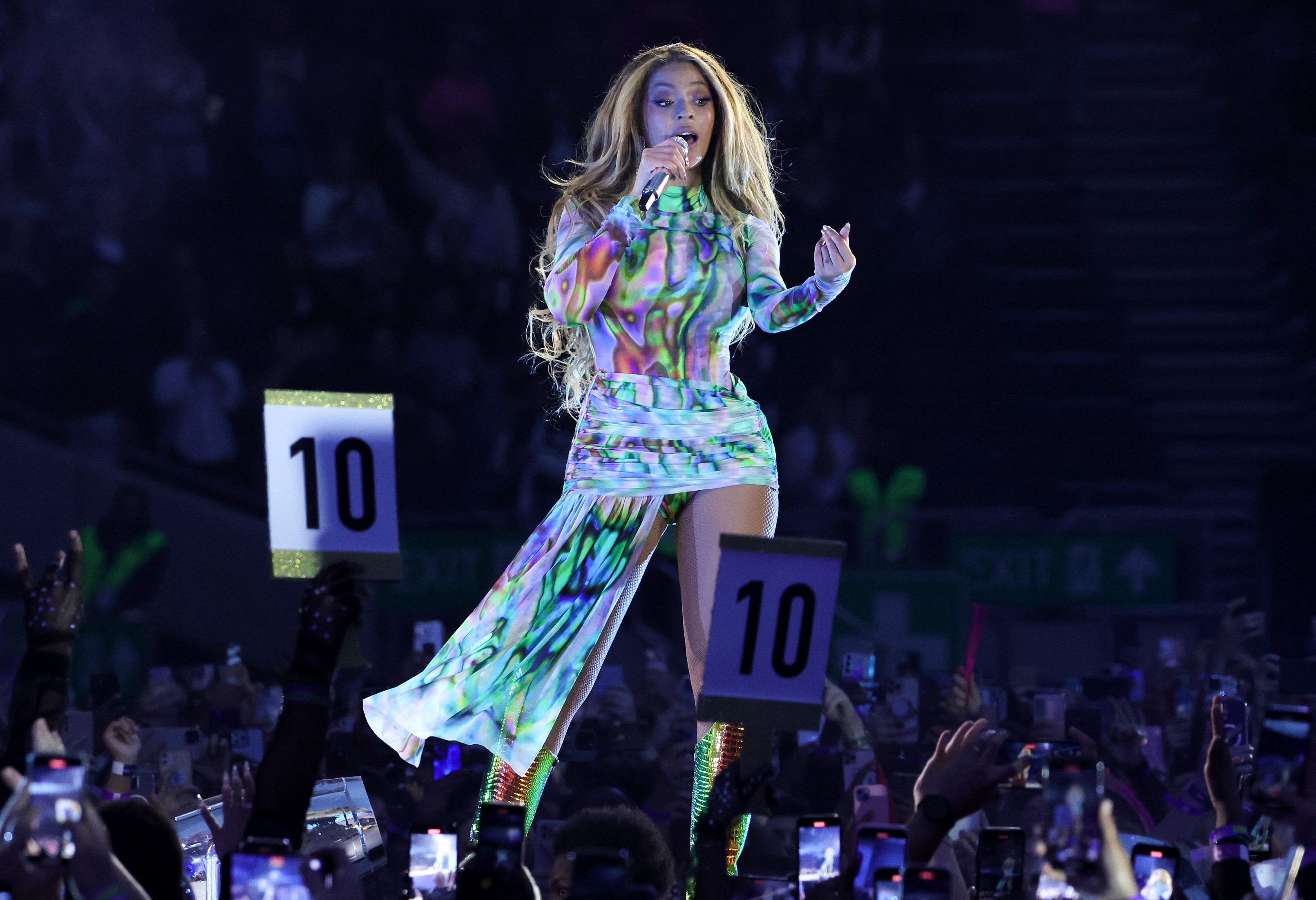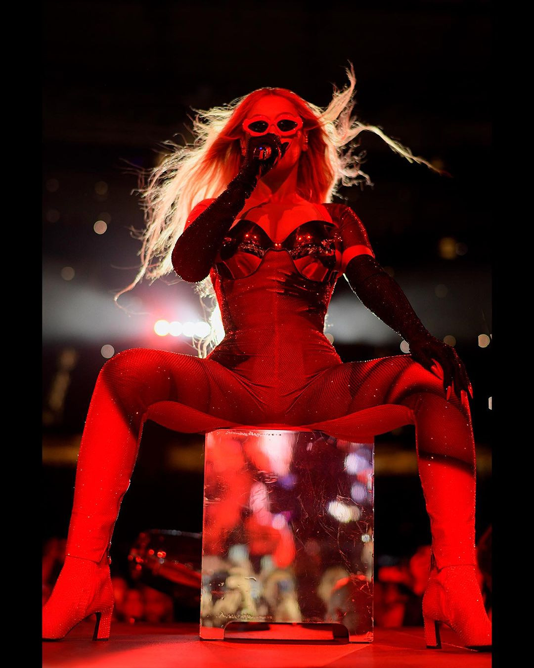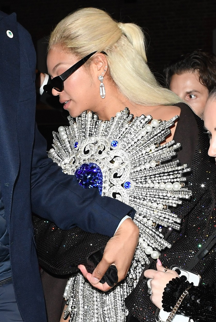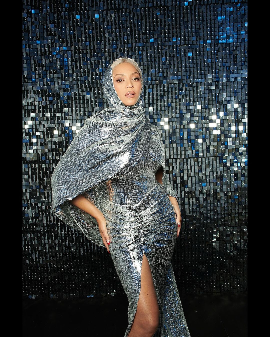 Beyonce a ales să poarte o ținută nonconformistă, din denim: o pereche de blugi cu talie înaltă, cu un model din paiete, și o geacă asortată. Piesa de rezistență a ținutei a fost sutienul albastru, bătut cu pietre prețioase. Vedeta a accesorizat totul cu o pereche de pantofi argintii și o pereche de ochelari de soare albi.