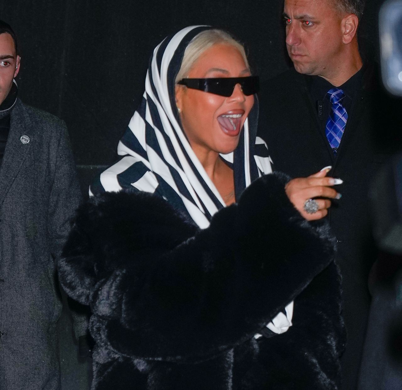 Arista a purtat o rochie în dungi, pe care a accesorizat-o cu un palton gros și ochelari de soare.