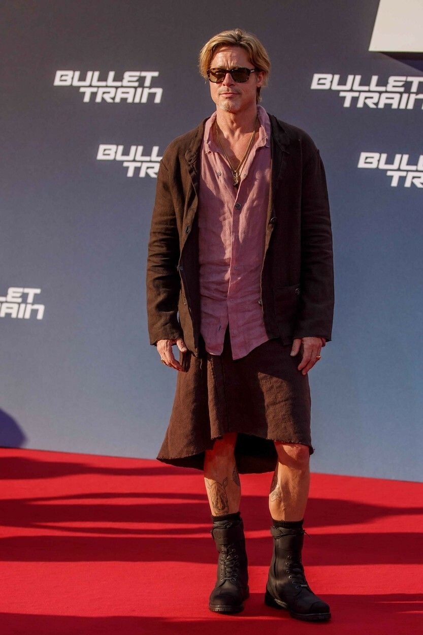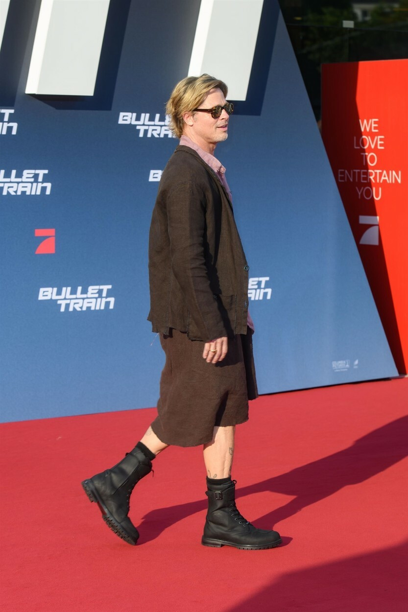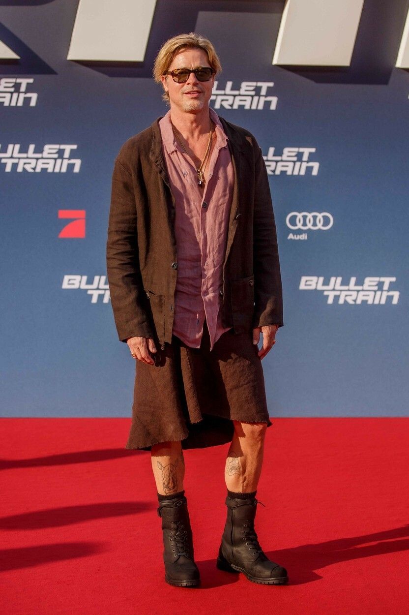 Glumeț și plin de energie, Brad Pitt și-a afișat fără rezerve nu doar tatuajele, ci și latura non-conformistă. Și-a epatat fanii din Berlin, apărând în fustă, după ce la conferința de presă de dinainte purtase o ținută complet roz.