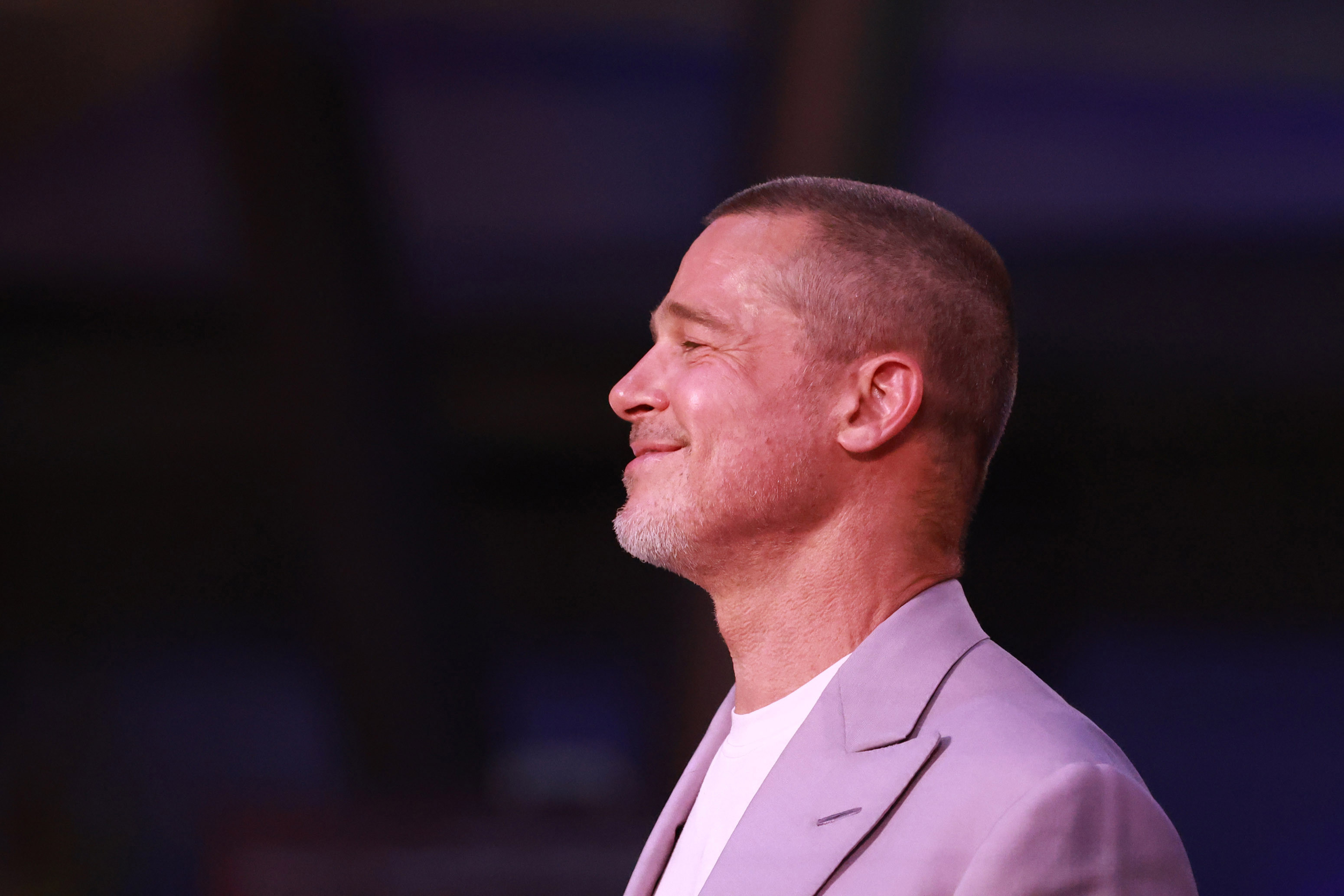 Pitt și-a schimbat costumul pastel de la premieră cu un look gri deschis, pe care l-a purtat din nou peste un tricou. Actorul a adăugat o batistă mov liliac, care ieșea discret din buzunarul sacoului, pentru un strop de culoare.