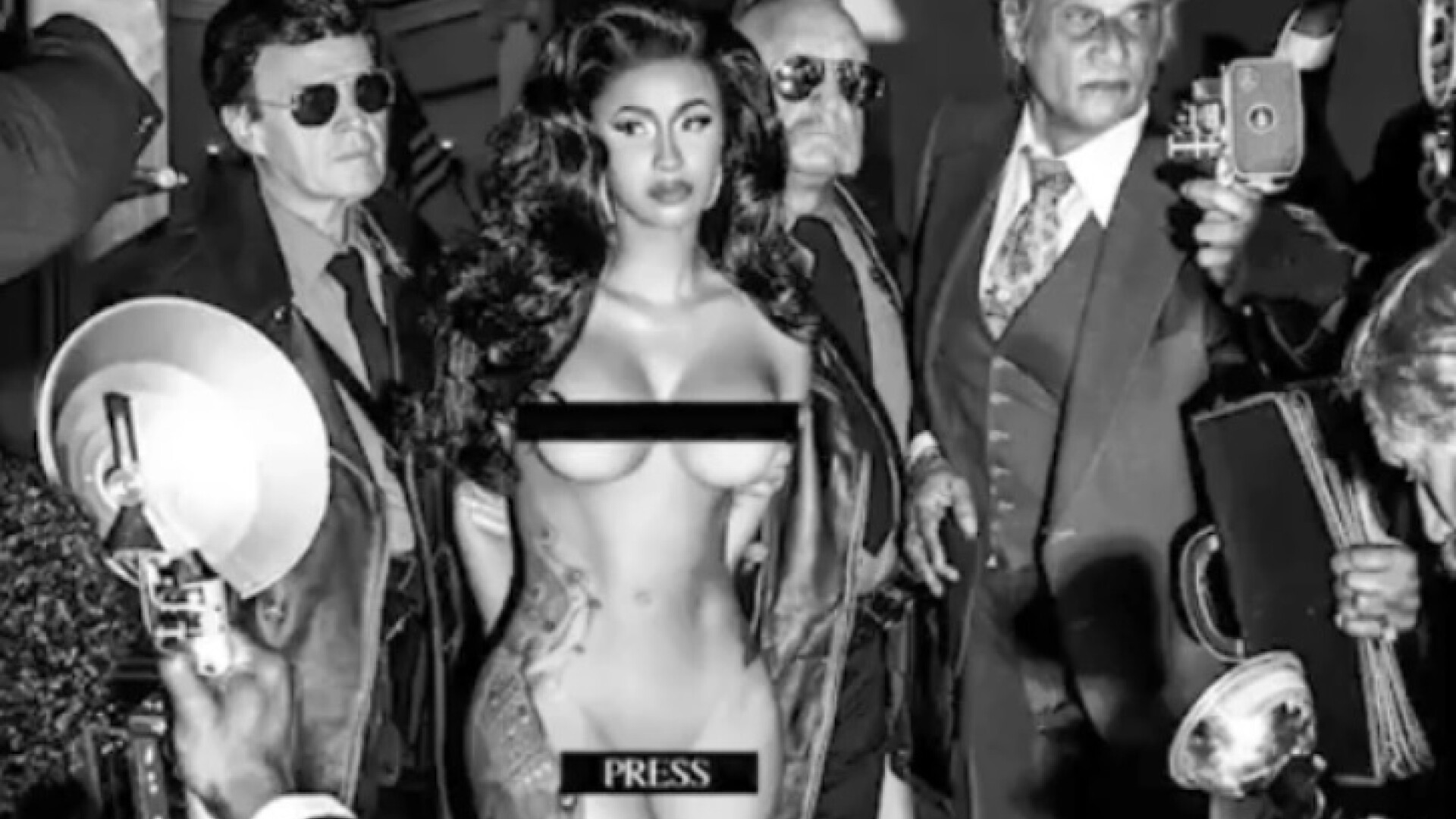 Înconjurată de un grup de paparazzi cu camere de fotografiat clasice, Cardi B apare complet goală, zonele sale intime fiind cenzurate de o simplă bandă neagră.