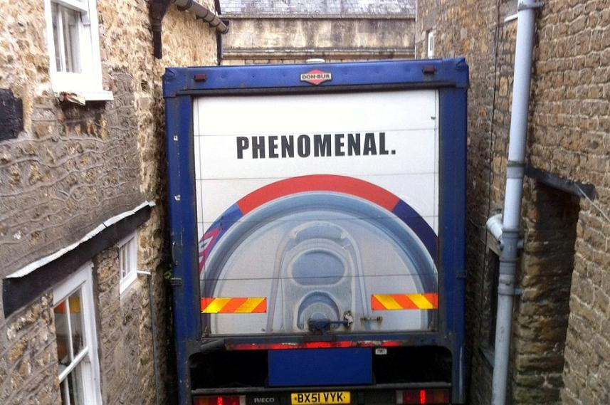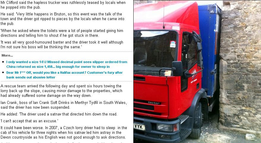 Soferul unei fime de bauturi a trebuit sa duca marfa unui client din Bruton, Somerset. Pentru ca nu mai fusese niciodata in zona, barbatul a apelat la GPS si a ascultat orbeste instructiunile acestuia.