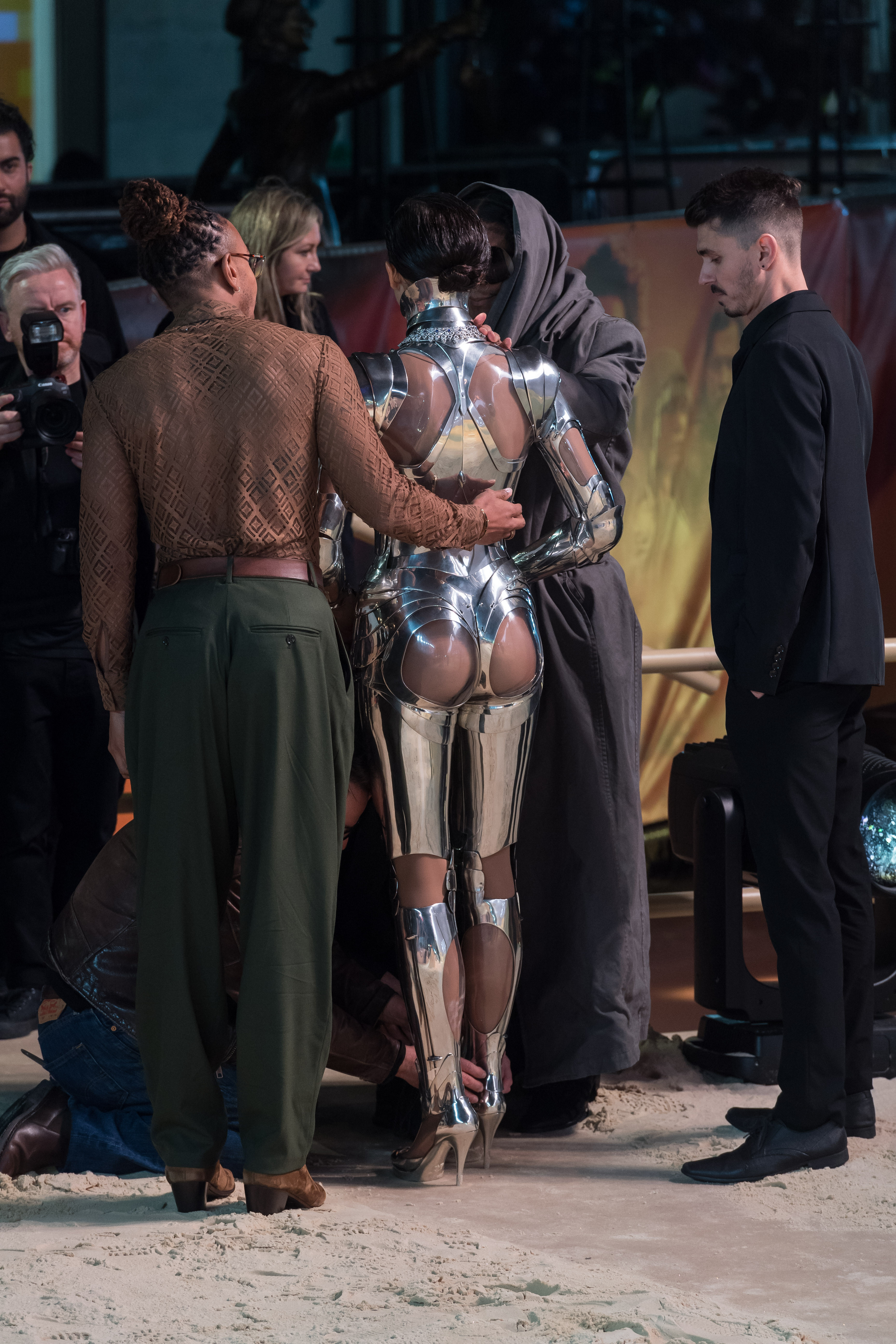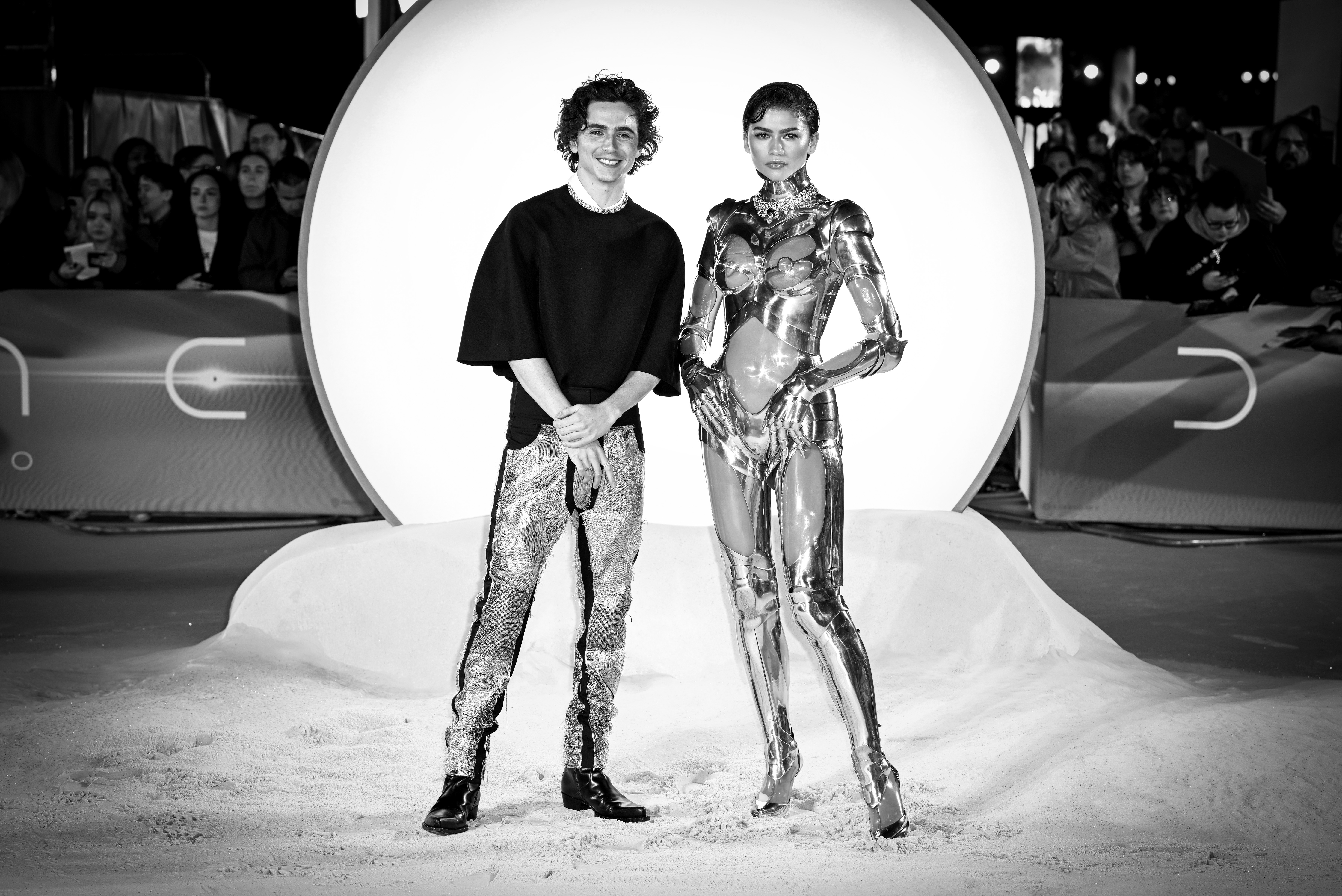 În timpul premierei mondiale a părții a doua a filmului, găzduită, joi, la Londra, vedete precum Zendaya, Timothée Chalamet și Florence Pugh au sosit purtând diverse ținute metalice care se potriveau cu estetica futuristă a peliculei.