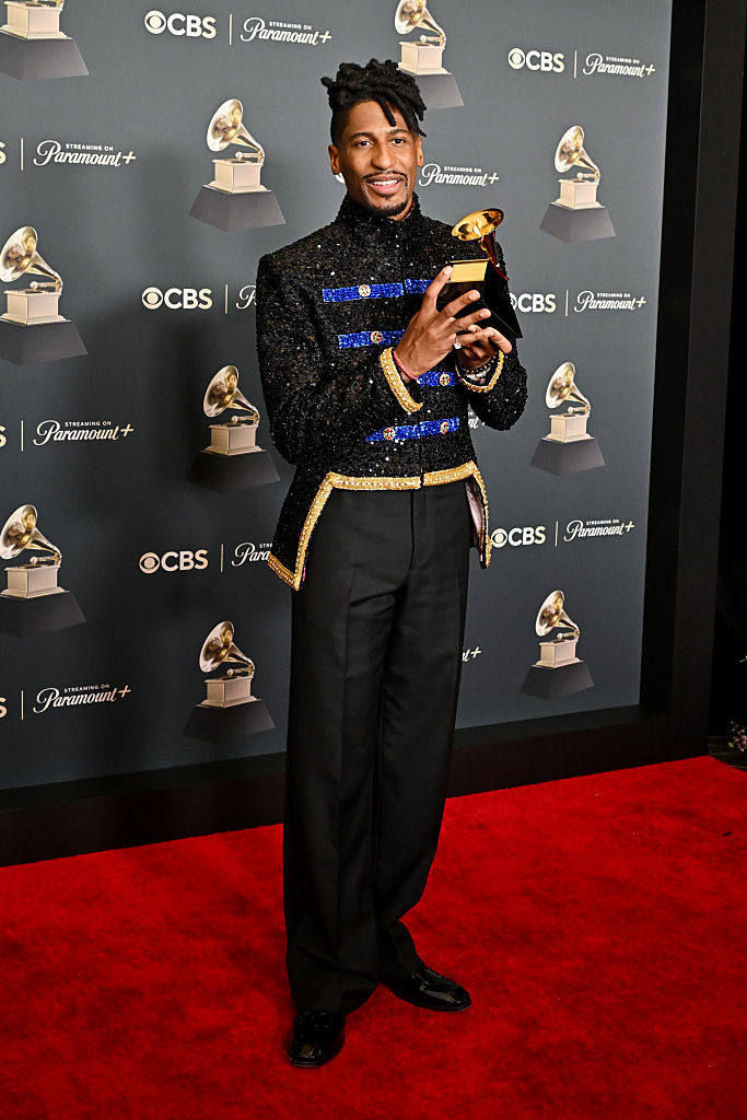 Shaboozey, nominalizat pentru cea mai bună piesă country solo și pentru cea mai bună interpretare duo/grup cu „Amen”, a sosit într-un ansamblu Bode, format din sacou și veston de tip tuxedo, o reinterpretare a cravatei bolo și blugi. Pantofii negri și o șapcă de pilot au completat ținuta.