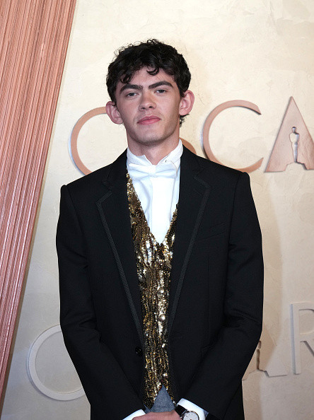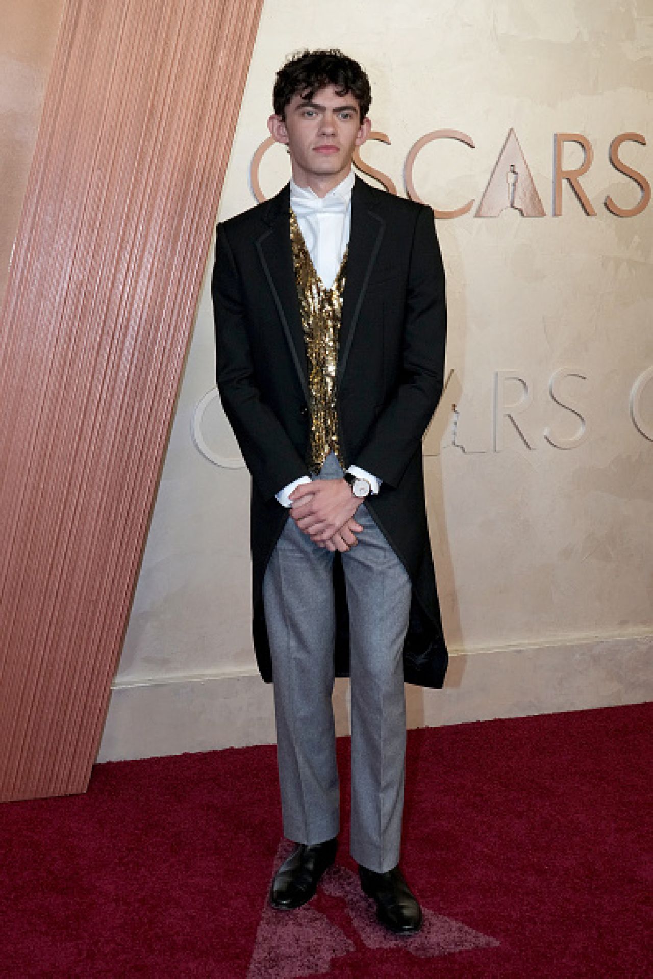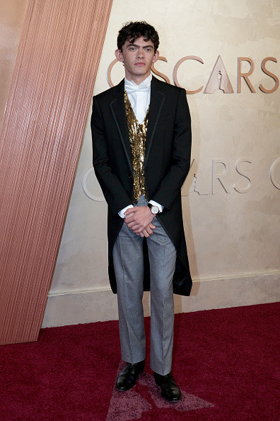 Actorul din serialul Netflix „Heartstopper” a purtat un mix de culori și piese care nu s-au armonizat. Ținuta sa a inclus o bluză albă cu papion asortat, un veston lung acoperit cu paiete aurii, pantaloni gri cu pense pronunțate și un sacou negru cu coadă.