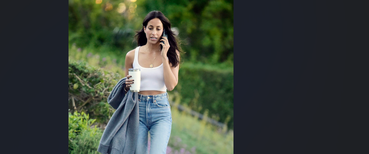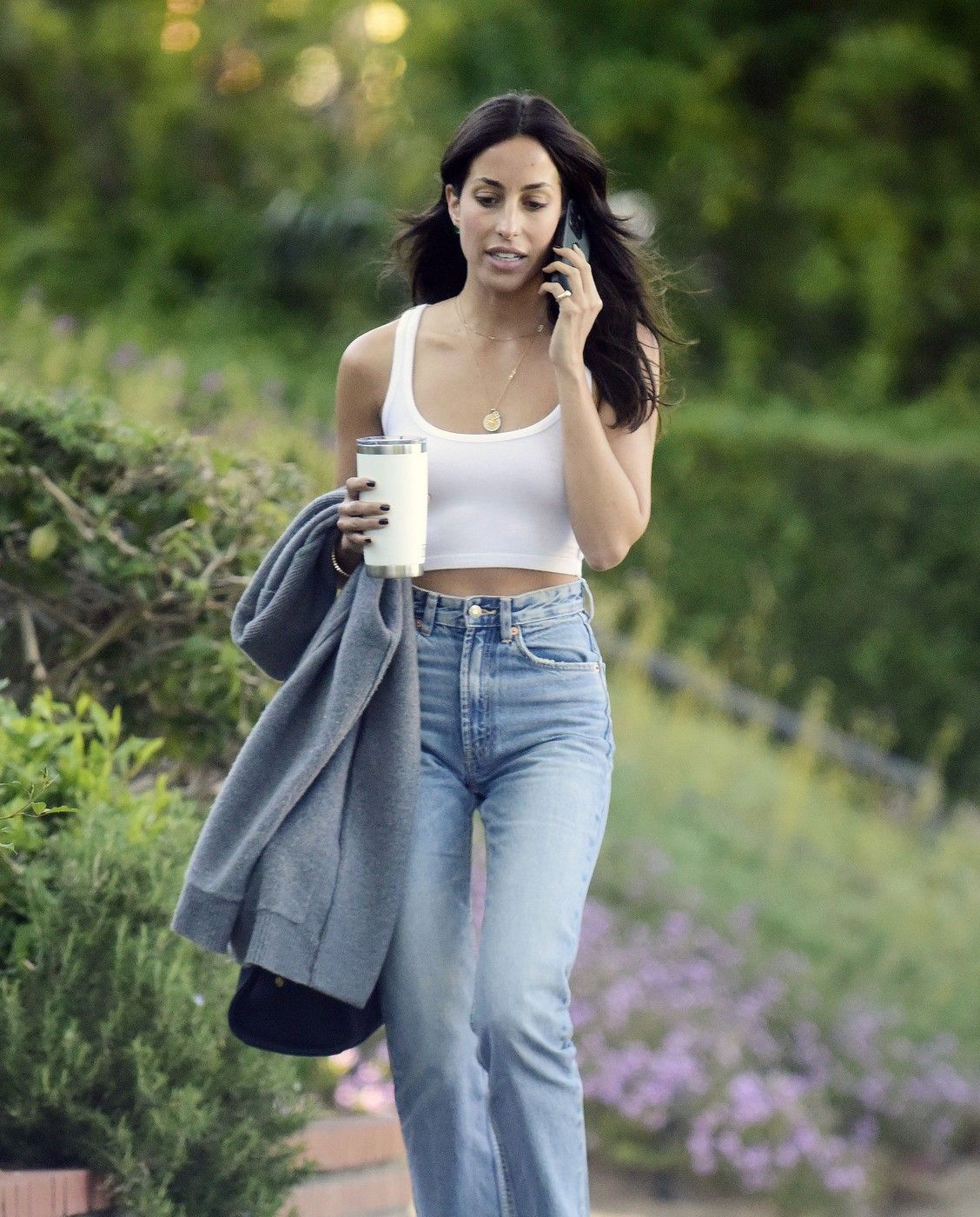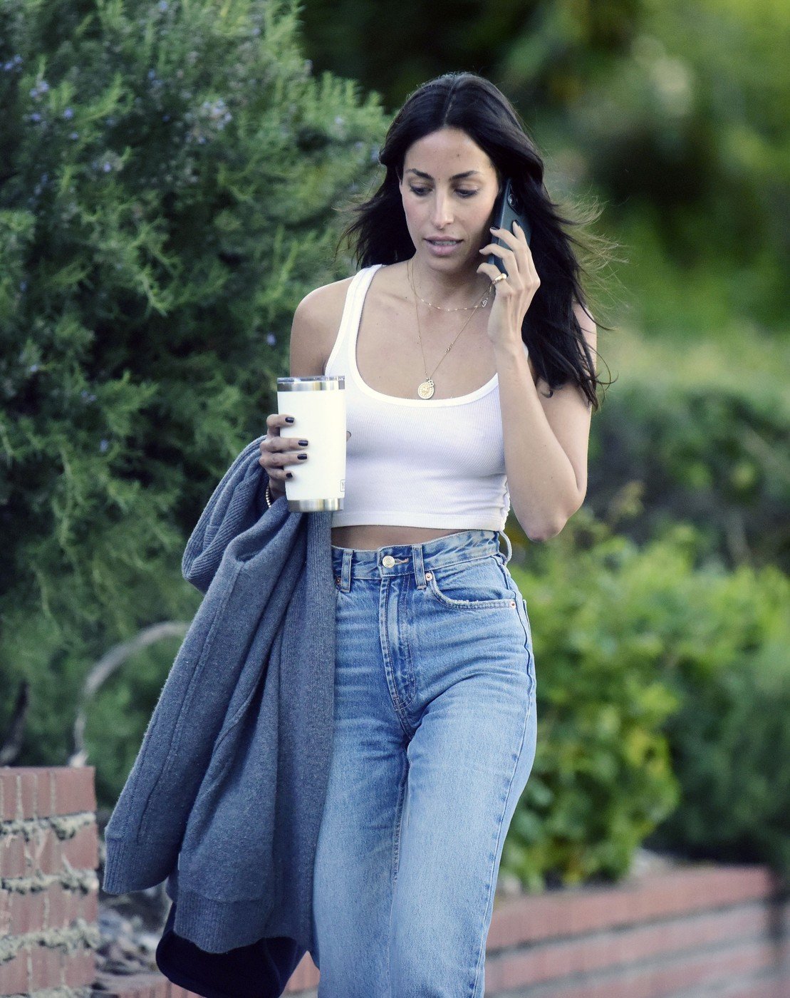 Vedeta a purtat un top alb mulat care îi punea în evidență abdomenul tonifiat, pe care l-a asortat cu o pereche de pantaloni din denim și o pereche de cizme maro.