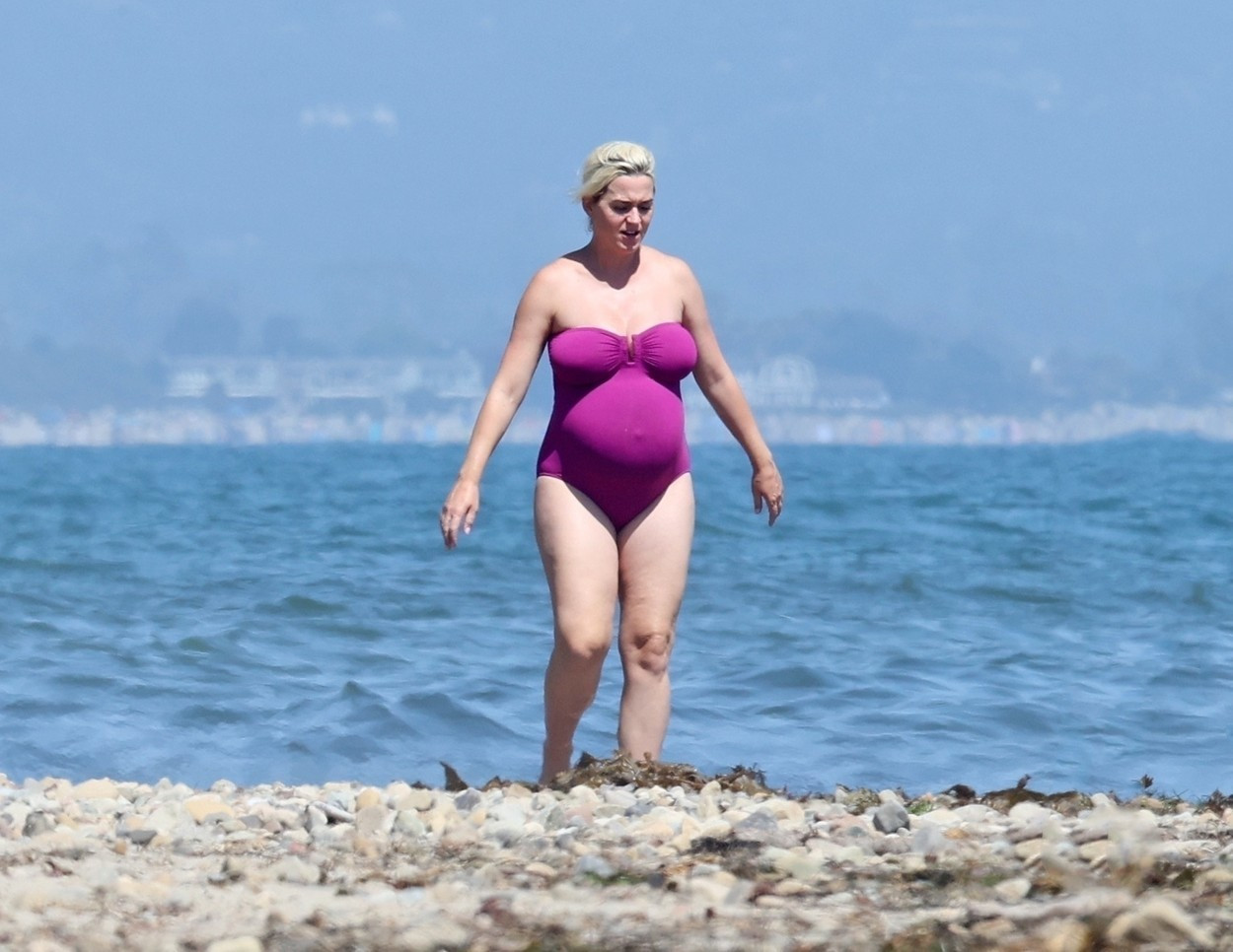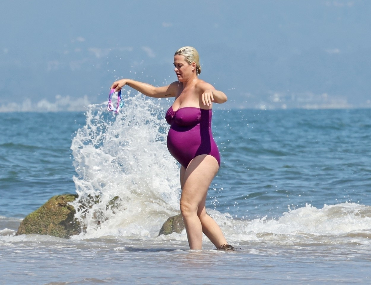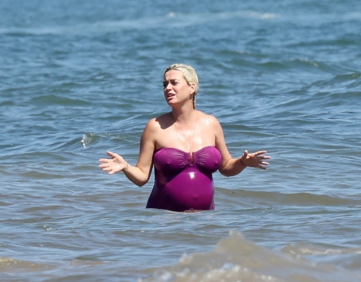 Katy Perry mai are foarte puțin până când va naște. Cântăreața de 35 de ani a fost surprinsă de paparazzi la plajă.