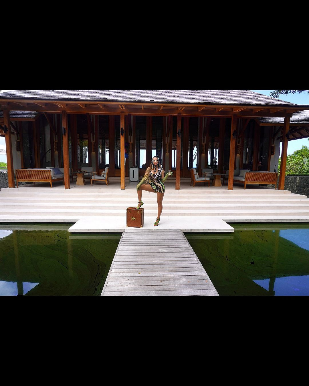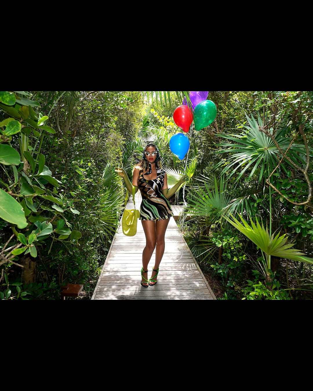 Una dintre imagini o arată pe vedetă purtând o rochie mini și sandale cu toc asortate, în timp ce ținea trei baloane aniversare. Vedeta împreună cu soțul ei se aflau într-o vacanță exotică.
