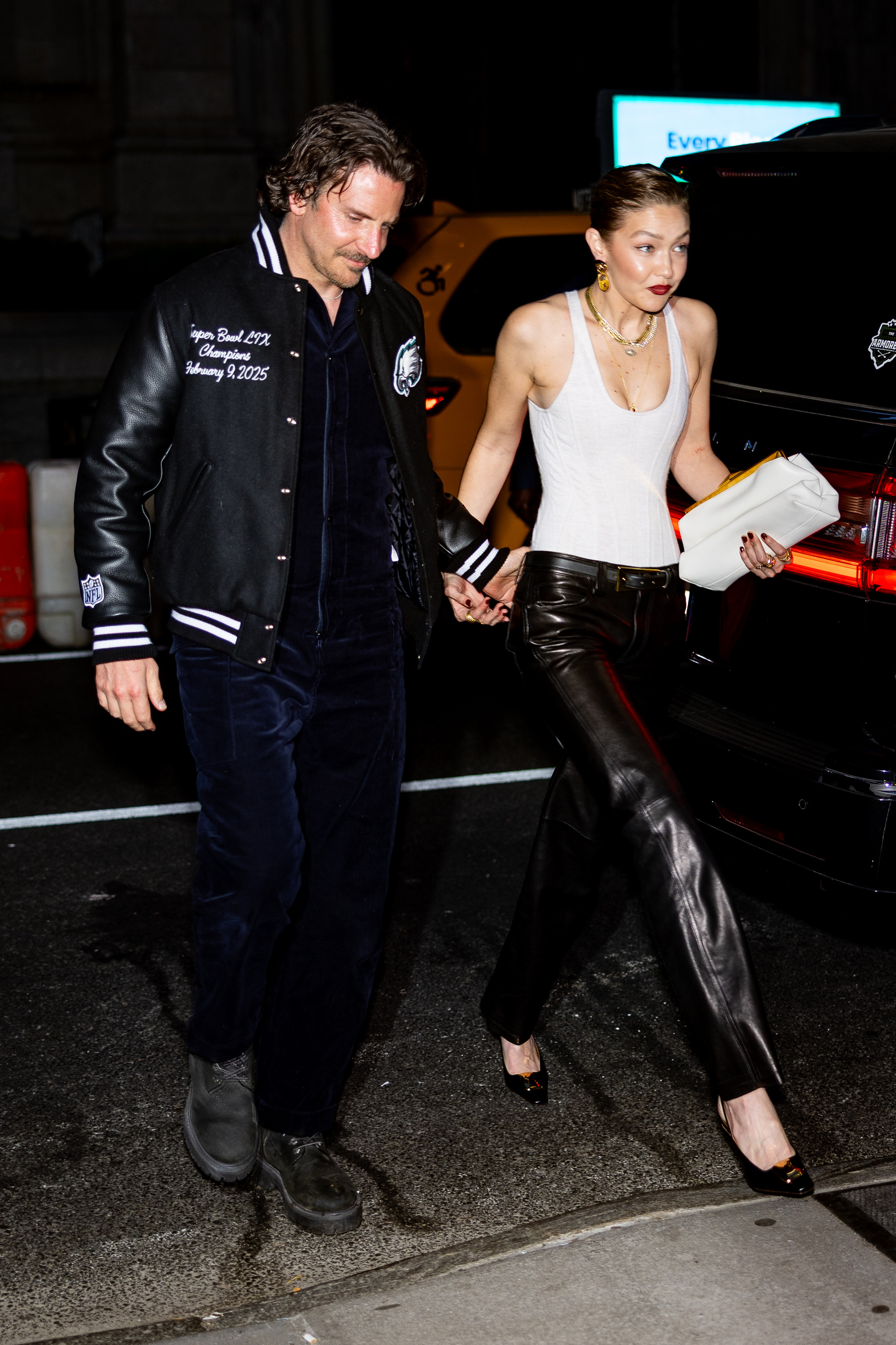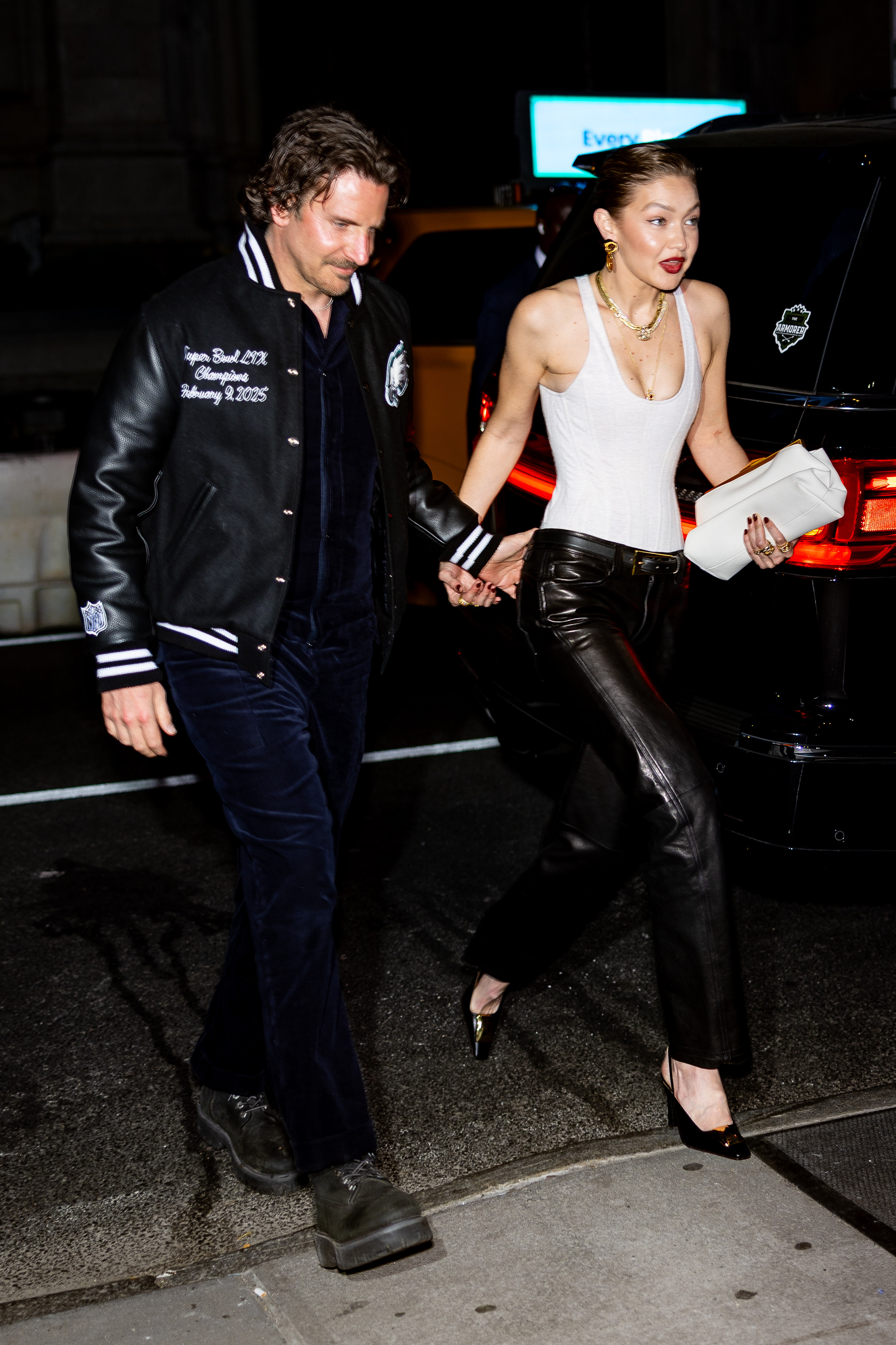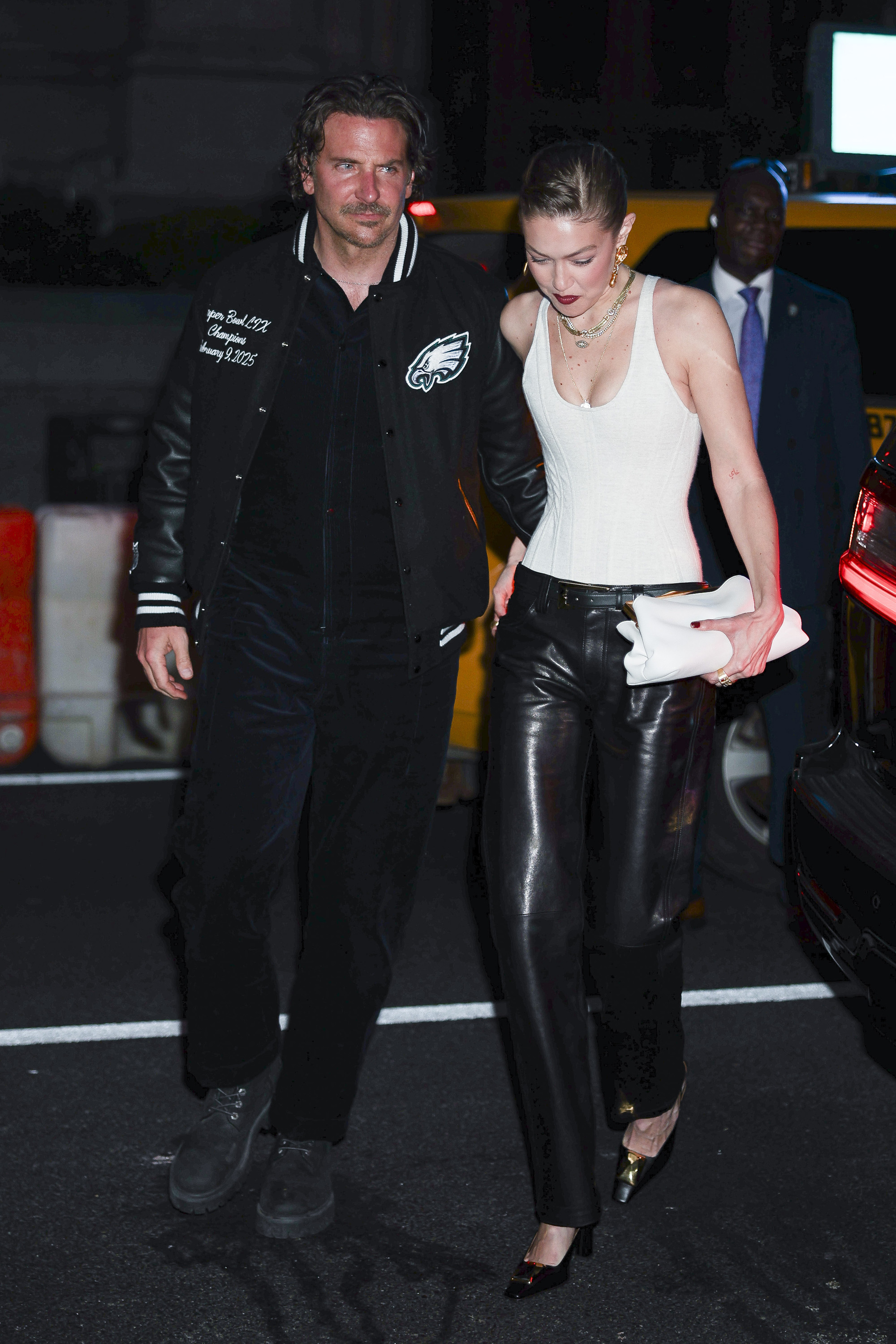 Modelul a purtat un corset alb și pantaloni din piele eleganți, în timp ce starul din „Maestro” a îmbrăcat o jachetă de echipă a Philadelphia Eagles, pe care a suprapus-o peste ce părea a fi o salopetă asortată.