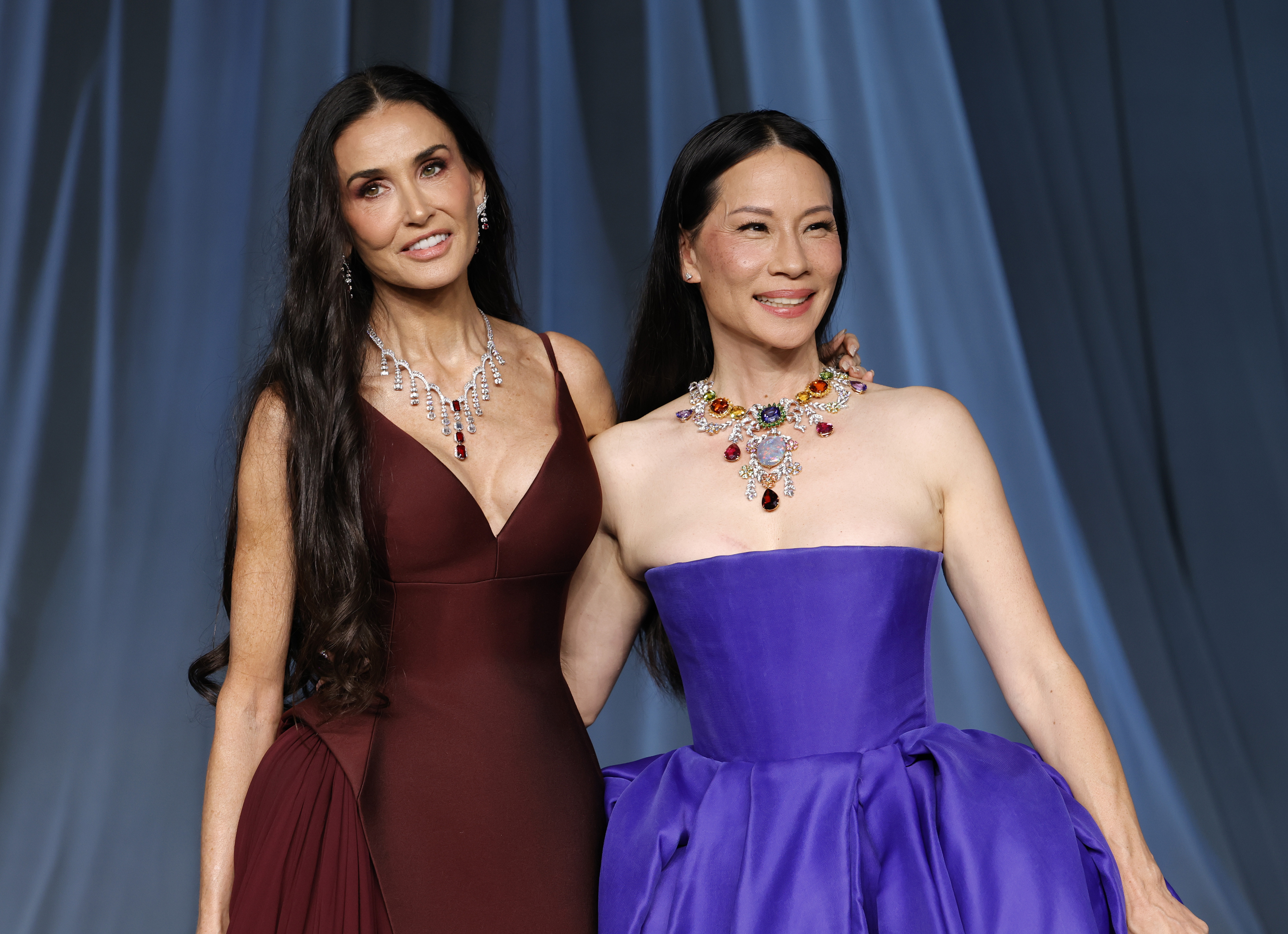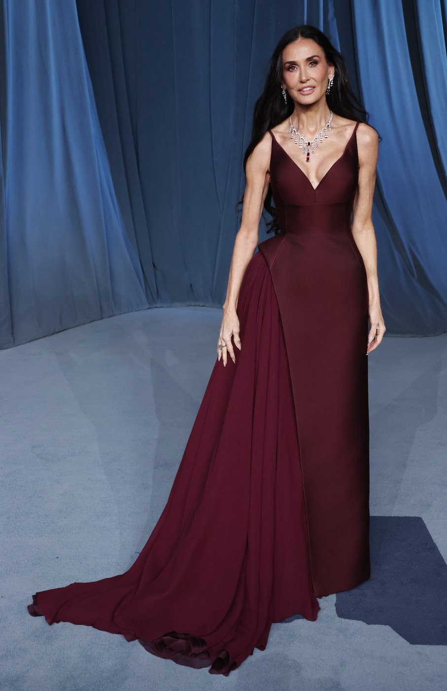Demi Moore a uimit prin eleganța atemporală. Actrița a pășit pe covorul roșu într-o rochie asimetrică, într-o nuanță intensă de mahon-burgund, semnată Prada, care i-a evidențiat silueta suplă. A completat ținuta cu un colier statement din diamante și rubine, piesa centrală a întregului look.