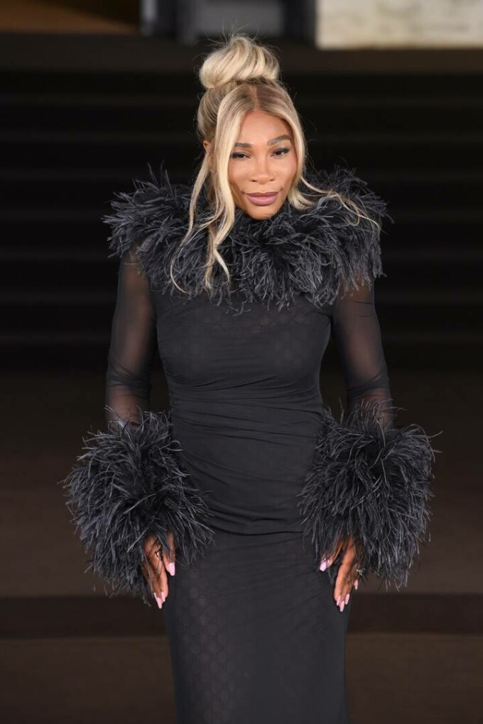 Serena Williams a strălucit într-o rochie neagră mulată din plasă, cu mâneci lungi decorate la manșete cu pene.