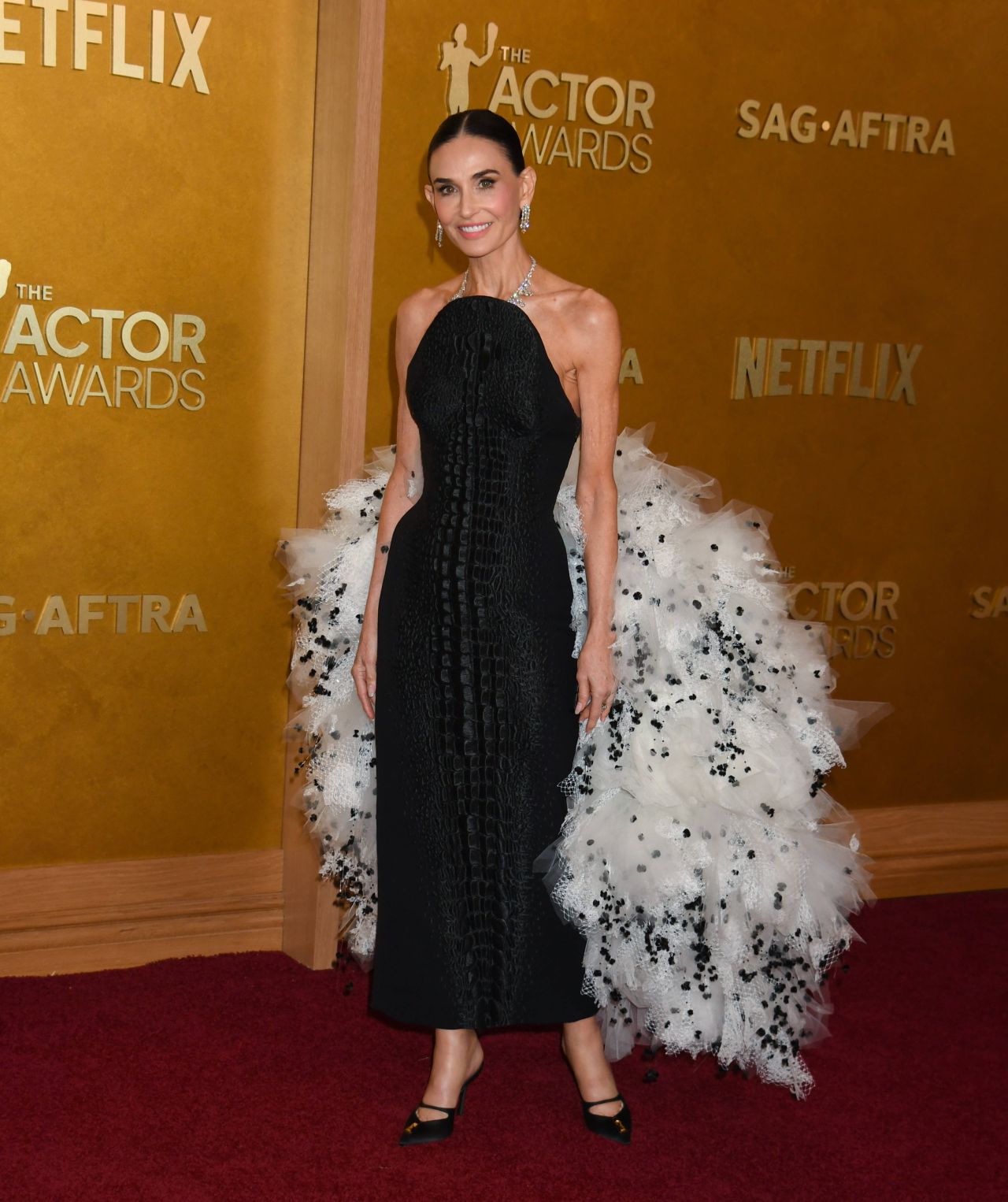 Rochia actriței a fost un model negru, fără bretele, mulat, până la gleznă, cu un detaliu aplicat în partea din față care crea efectul vizual al unei cozi de crocodil, potrivit Yahoo News.