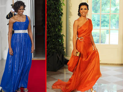 Eva Longoria a purtat o rochie orange, croita dupa modelul tinutelor grecesti, in timp ce Prima Doamna a imbracat o rochie albastra, prinsa in talie cu o centura argintie.