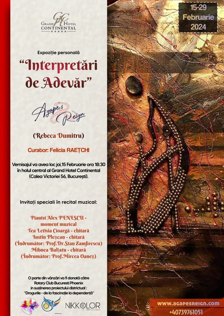 Vernisajul are loc în data de joi 15 februarie 2024, orele 18:30, în holul central al Hotelului Grand Continental din București.