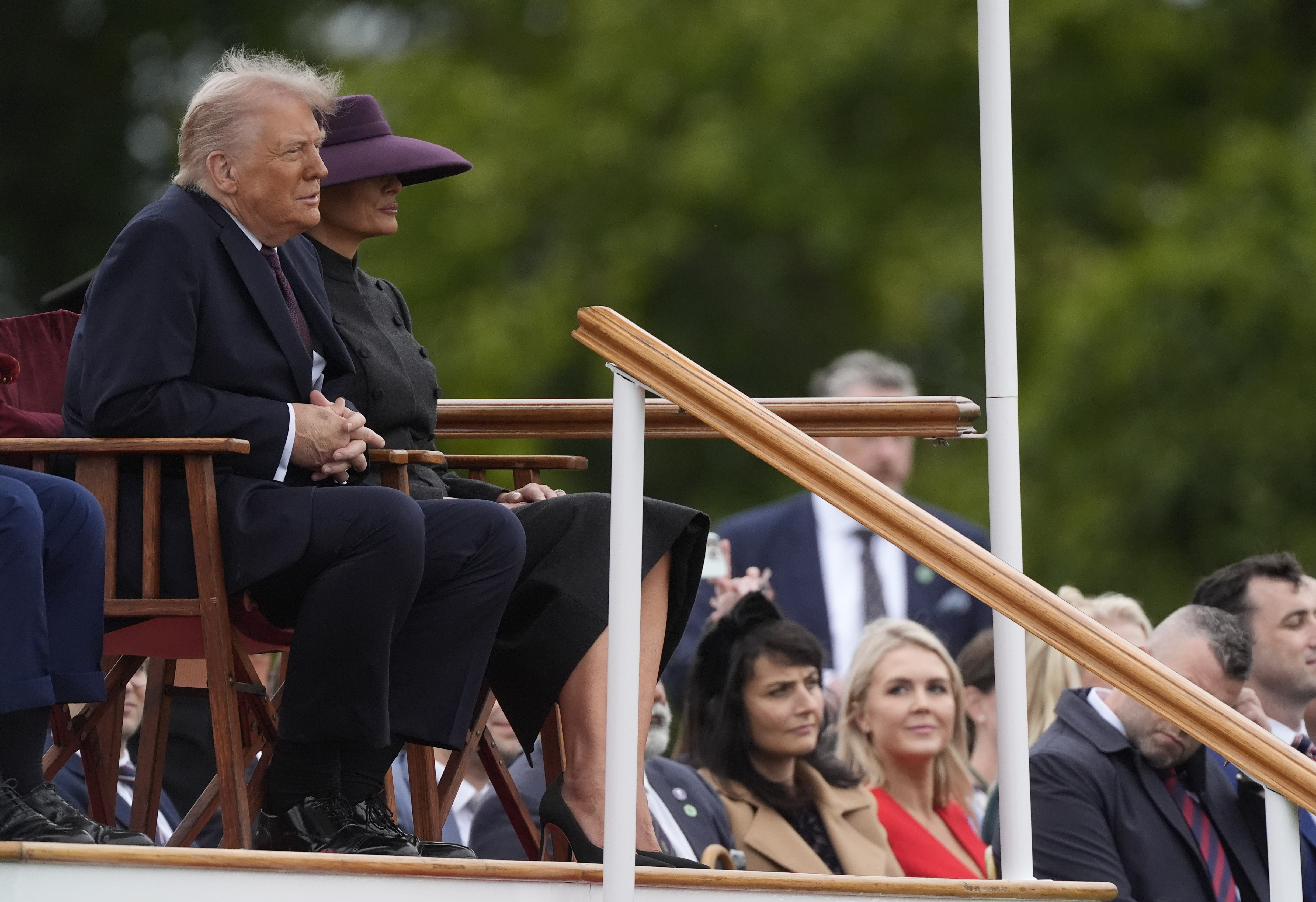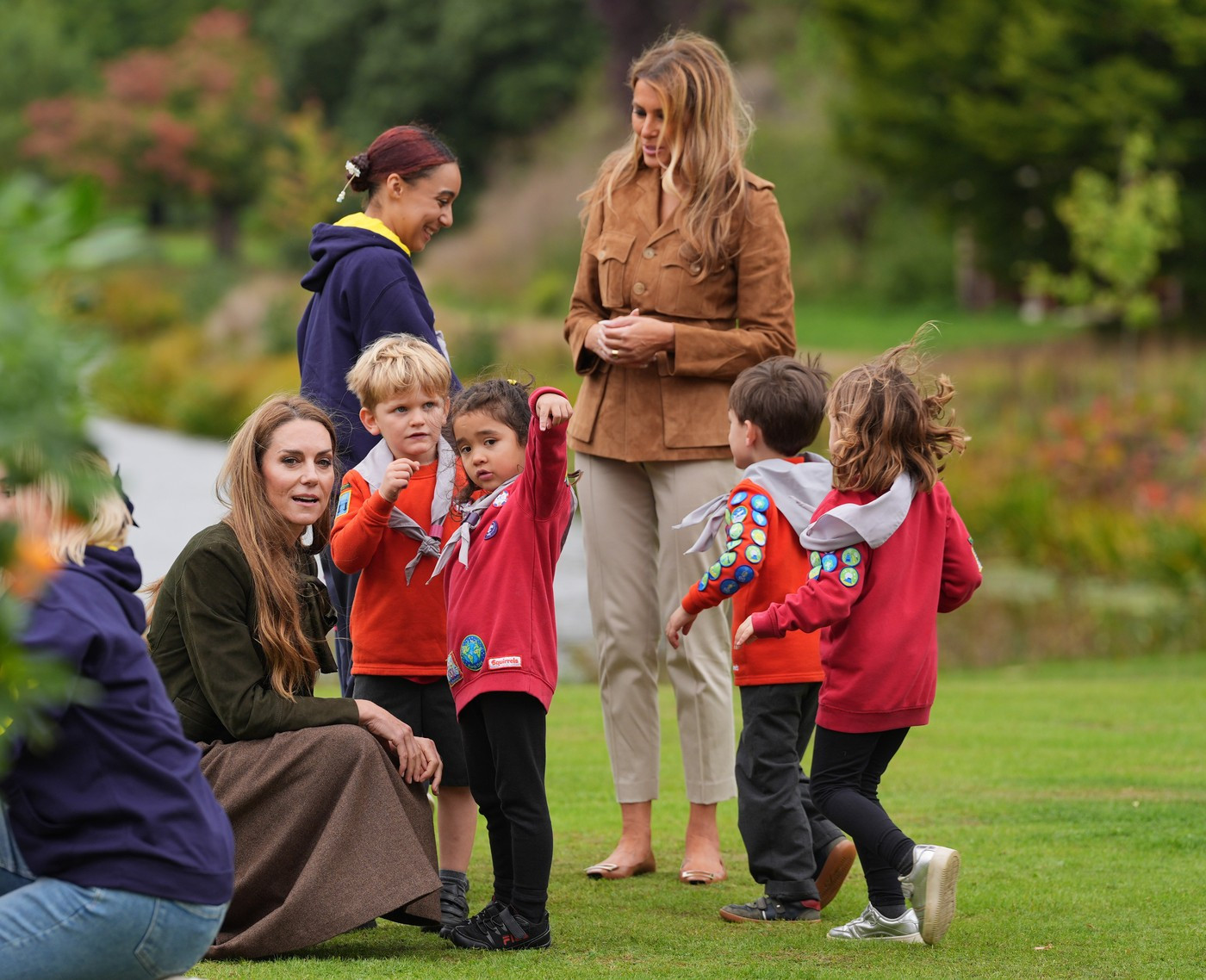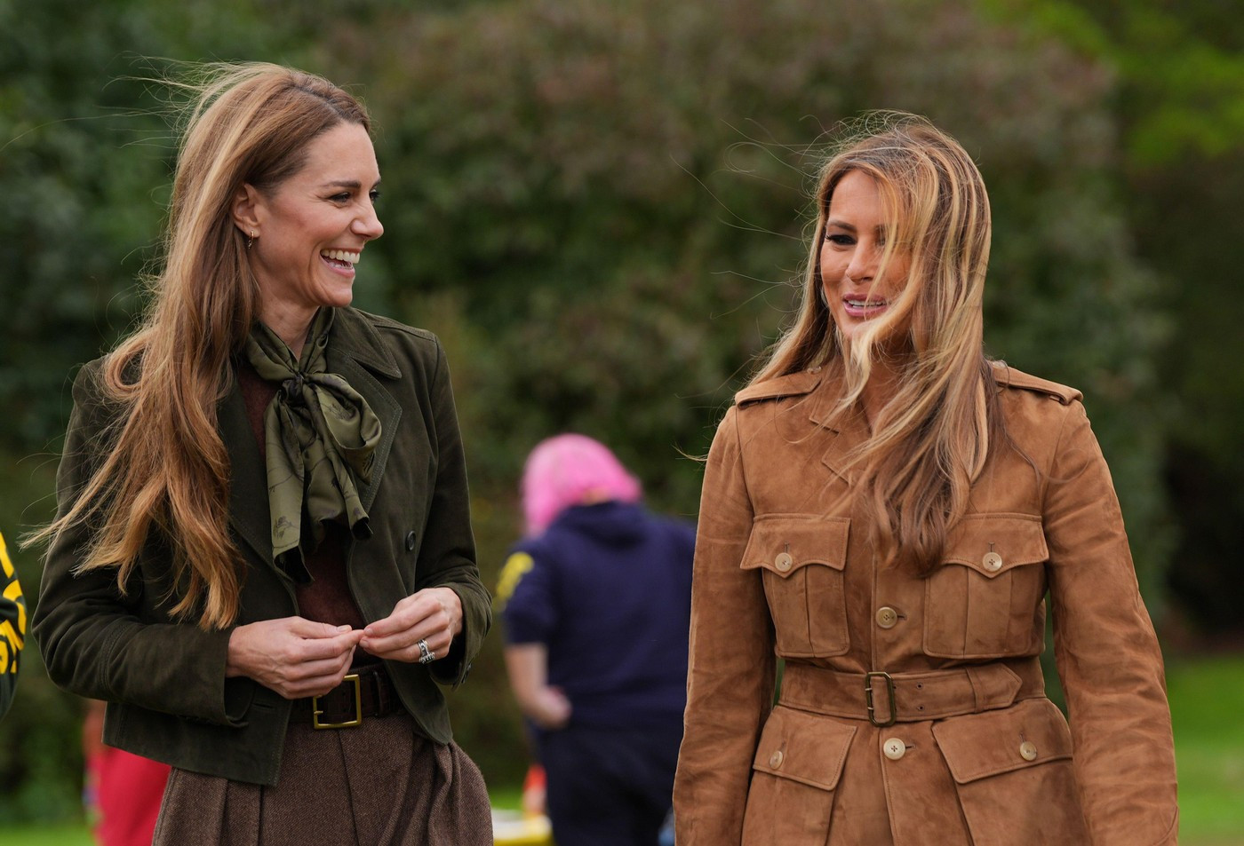 Prințesa — copreședinte al Asociației Cercetașilor — a purtat o jachetă și un veston din piele întoarsă verde măsliniu marca ME+EM, asortate cu o fustă midi plisată maro și cizme. Melania a ales o jachetă cargo din piele întoarsă bej, purtată cu pantaloni deschiși la culoare.