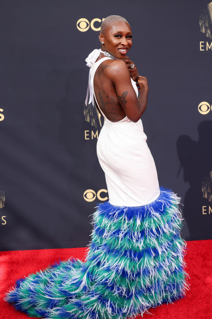 Cynthia Erivo și-a făcut apariția pe covorul roșu îmbrăcată într-o rochie semnată Louis Vuitton, de culoare albă. Terminația ținutei este însă deosebită, fiind compusă din fulgi în trei culori: alb, verde și albastru.