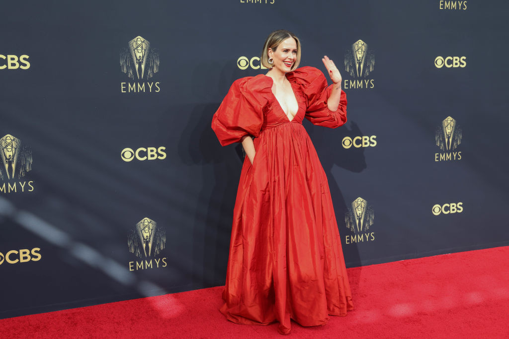 Actrița Sarah Paulson a fost, de asemenea, o apariție inedită la Premiile Emmy. Artista a purtat o rochie roșie cu un decolteu adânc și mânecile bufante, semnată Carolina Herrera.