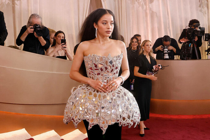 Vedeta din ”One Battle After Another”, Chase Infiniti, a purtat o rochie Louis Vuitton avangardistă, cu un corset sculptural, asemănător unei oglinzi.