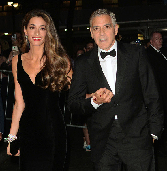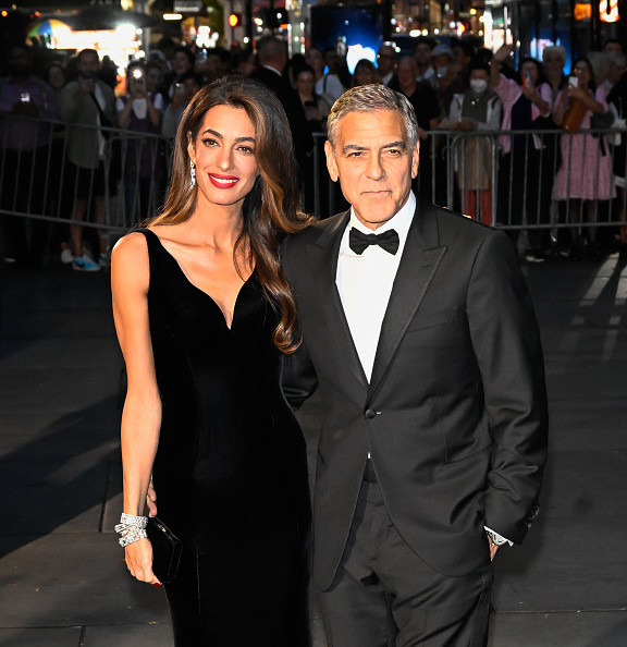 Soția sa, cu care s-a căsătorit în 2014, a avut și ea o ținută deosebită. Amal Clooney a purtat o rochie din catifea neagră, mulată, care avea un corset strâns și o trenă scurtă ce se lăsa elegant în spatele ei. Ținuta sofisticată avea un decolteu adânc în față, fiind susținută de bretele groase care îi acopereau umerii.