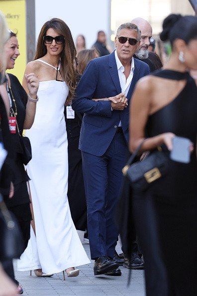 Cu ocazia acestui eveniment elegant, Amal (47 de ani) a purtat cu o rochie romantică, alb pudrat, pe care a accesorizat-o cu bijuterii argintii.