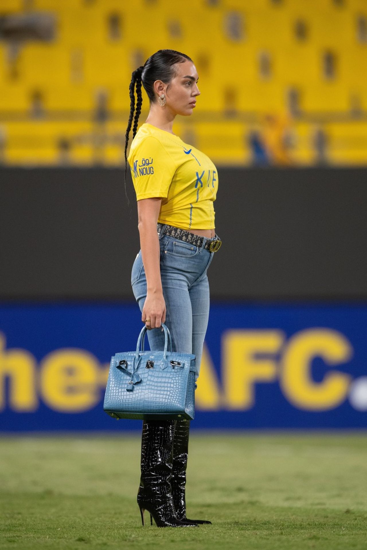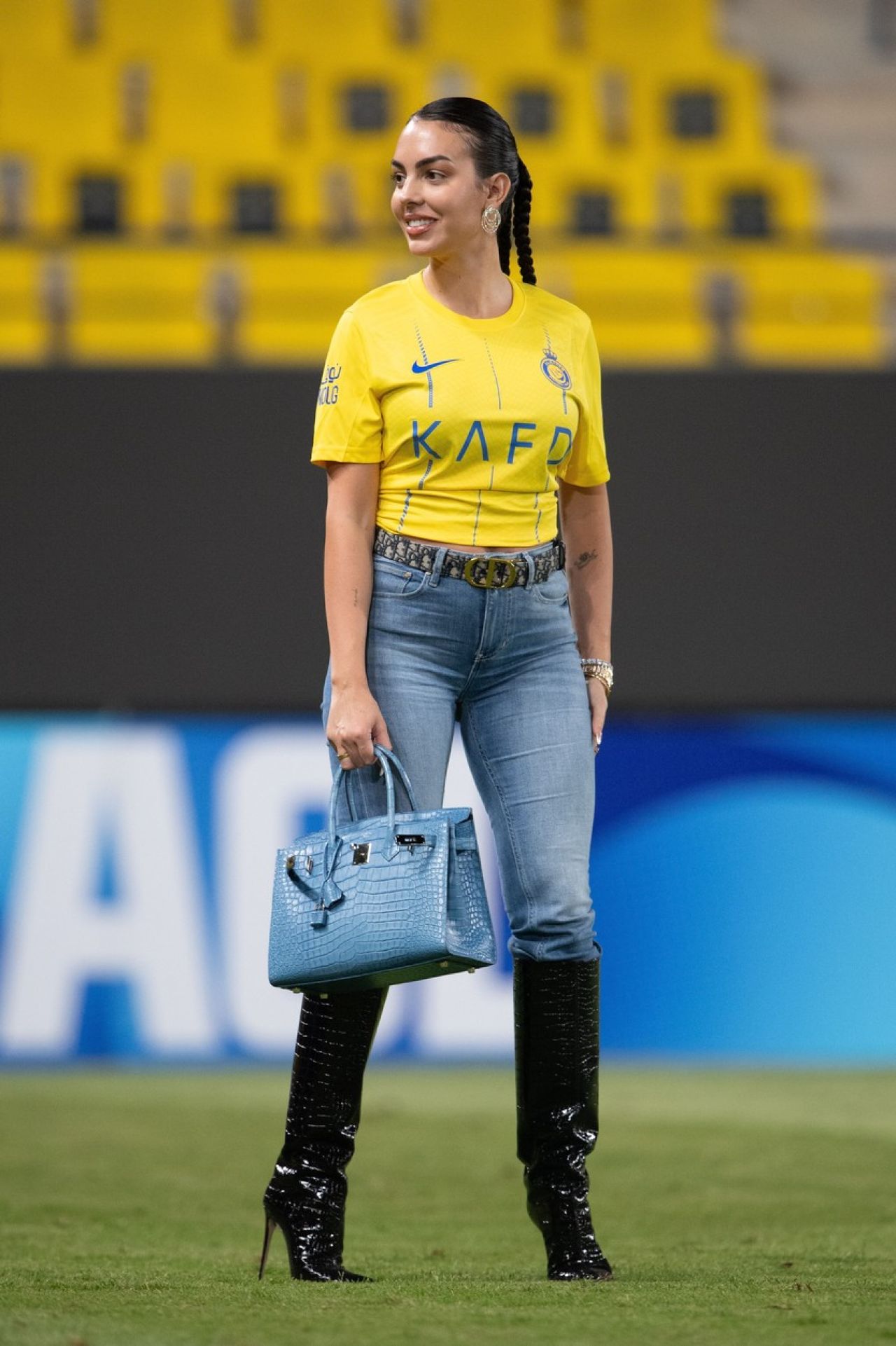 Modelul în vârstă de 29 de ani a purtat o pereche de blugi mulați, cizme și un tricou al echipei Al-Nassr.