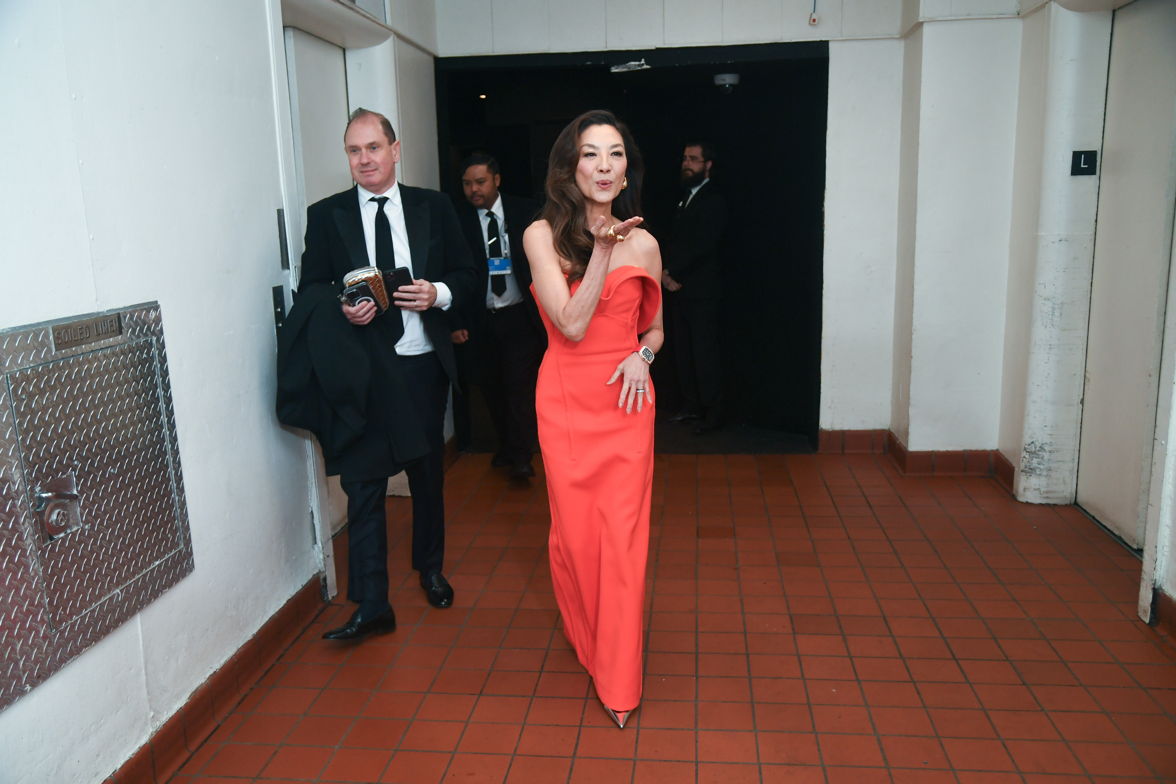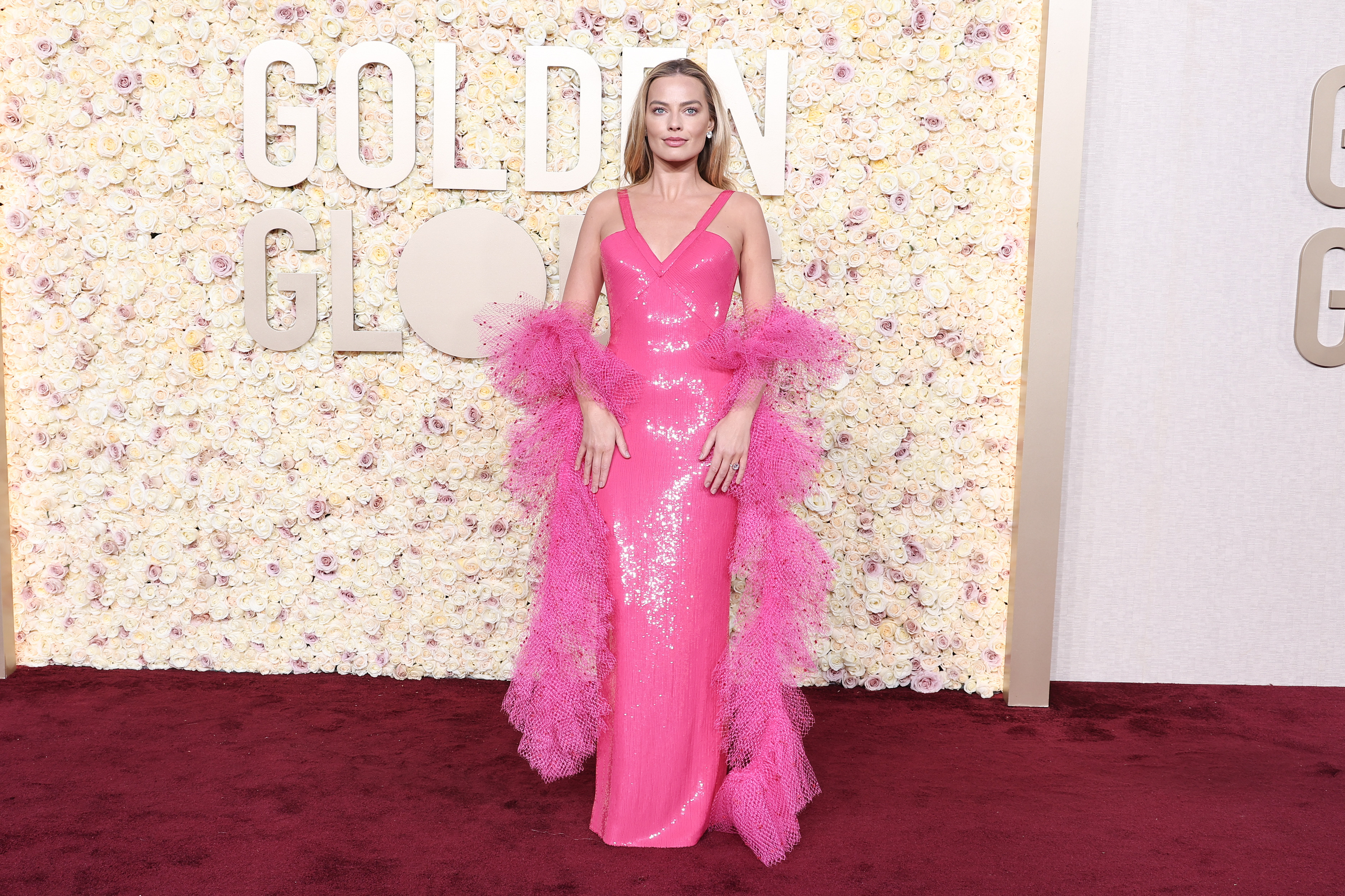 Margot Robbie a purtat o rochie cu paiete roz şi un şal de tul a producătoarei/vedetă din "Barbie", care a fost inspirată de fapt de ţinuta unei păpuşi "SuperStar Barbie", creată în 1977. Look-ul a fost accentuat cu bijuterii prețioase, cercei şi un inel cu 33 de carate de diamante albe şi roz, evaluate la peste 3 milioane de dolari, şi a fost completat cu pantofi roz satinat.