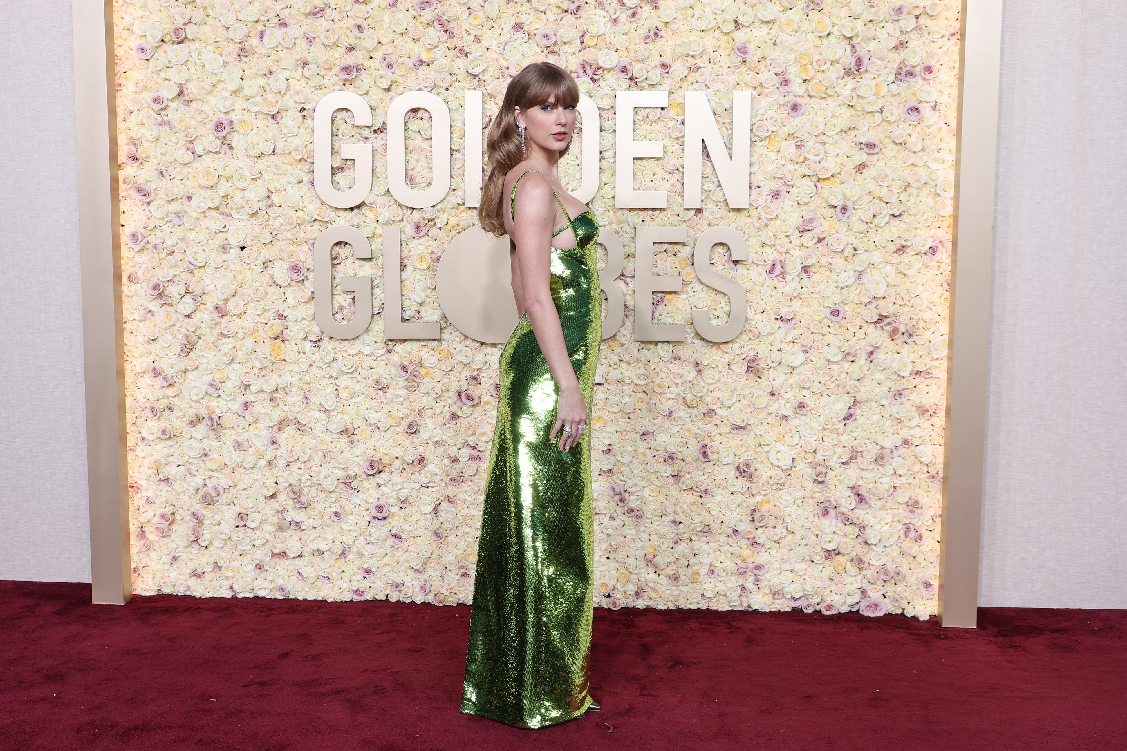 Taylor Swift a strălucit într-o rochie cu paiete de culoare verde, în timp ce bijuteriile sale totalizau peste 33 de carate de diamante albe. Taylor a completat look-ul cu pantofii stiletto din piele verde.