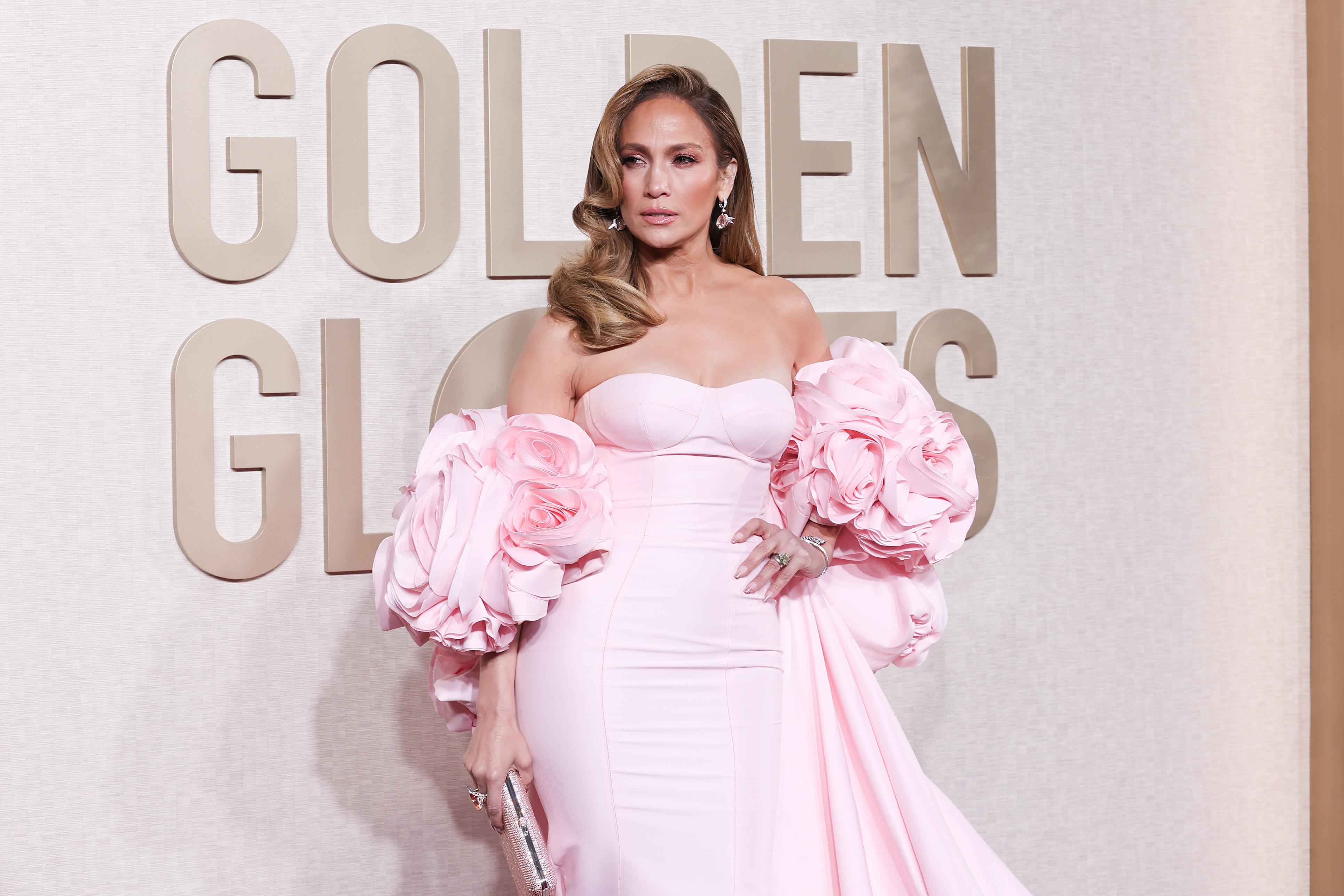 Jennifer Lopez a atras atenția cu o rochie roz deschis cu umerii goi, cu o trenă uriașă și detalii florale impresionante. Look-ul romantic al lui J.LO a fost creat de surorile designer Nicole şi Felicia Chang, a căror marcă excelează în materie de ţinute de lux pentru mirese şi ocazii speciale.