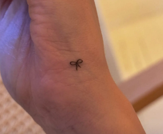Desenul este unul elegant. Un tatuaj mic, negru, cu o fundiță subțire, care pare să nu fie mai mare decât o gumă de șters.