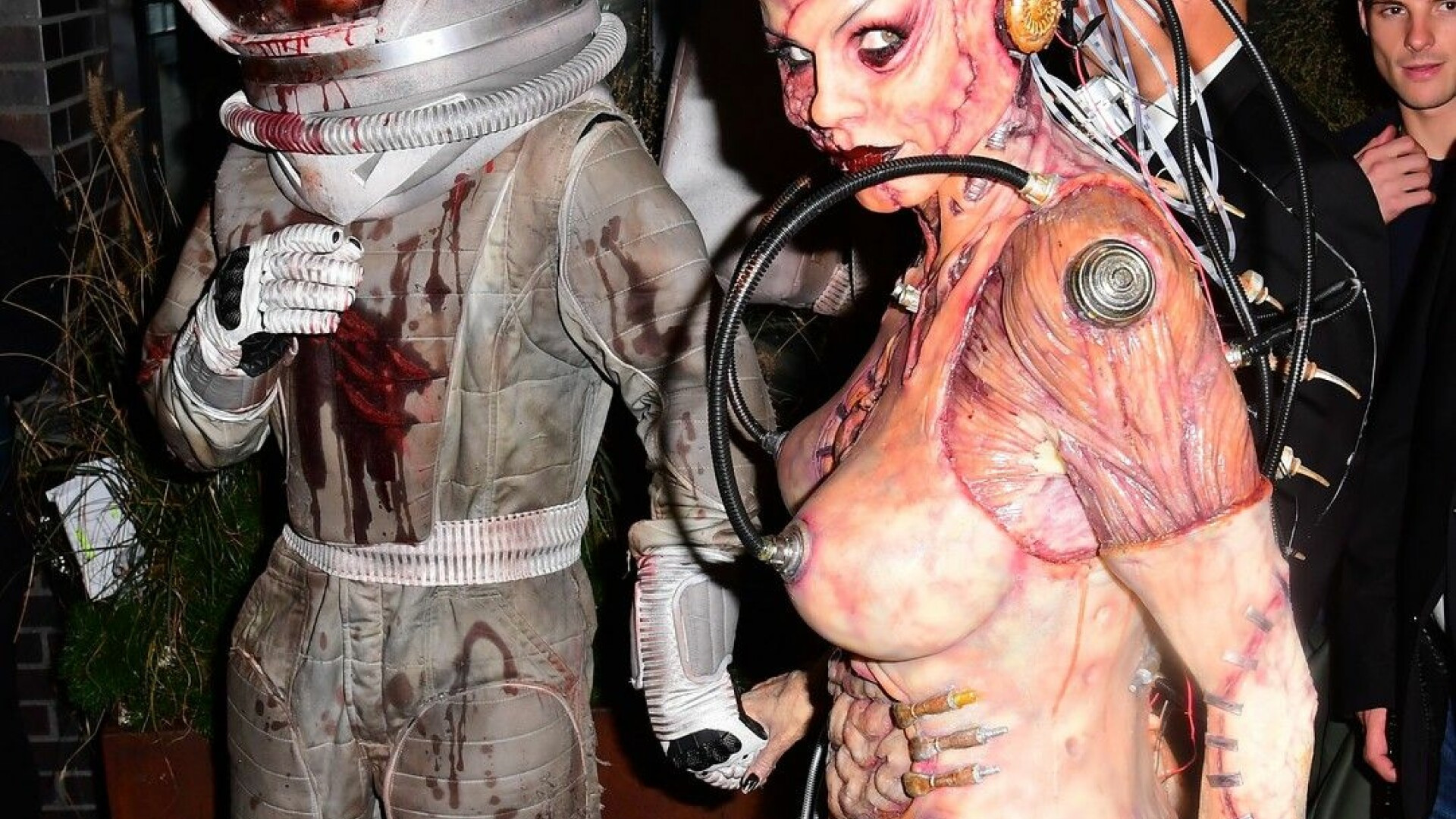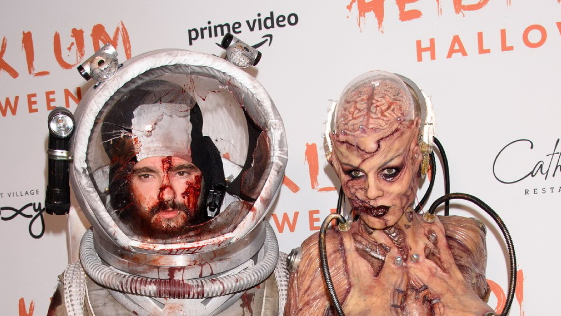 Klum a ajuns la petrecerea de Halloween în cursul nopţii, însoţită de soţul său, Tom Kaulitz, costumat într-un astronaut plin de sânge, conform Mashable.