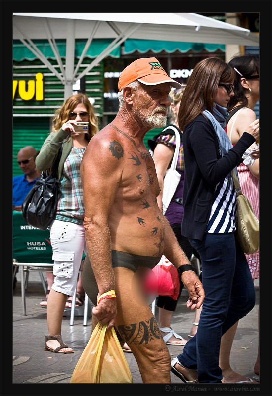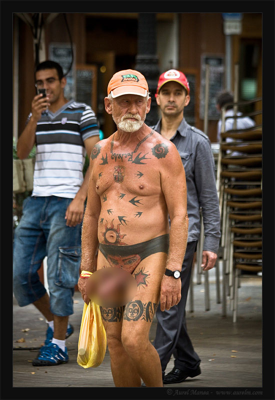 Omul nu are nicio jena in a-si expune tatuajele si desenele care ii acopera trupul, nici macar pe cele din zonele intime.