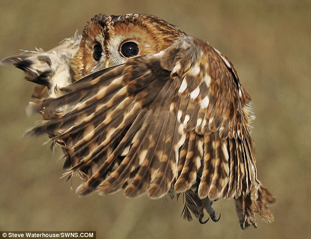 Zborul atipic al bufnitei a fost surprins in fotografii de Steve Waterhouse, in varsta de 52 de ani, in apropiere de casa sa din Plympton, Devon, Marea Britanie.
