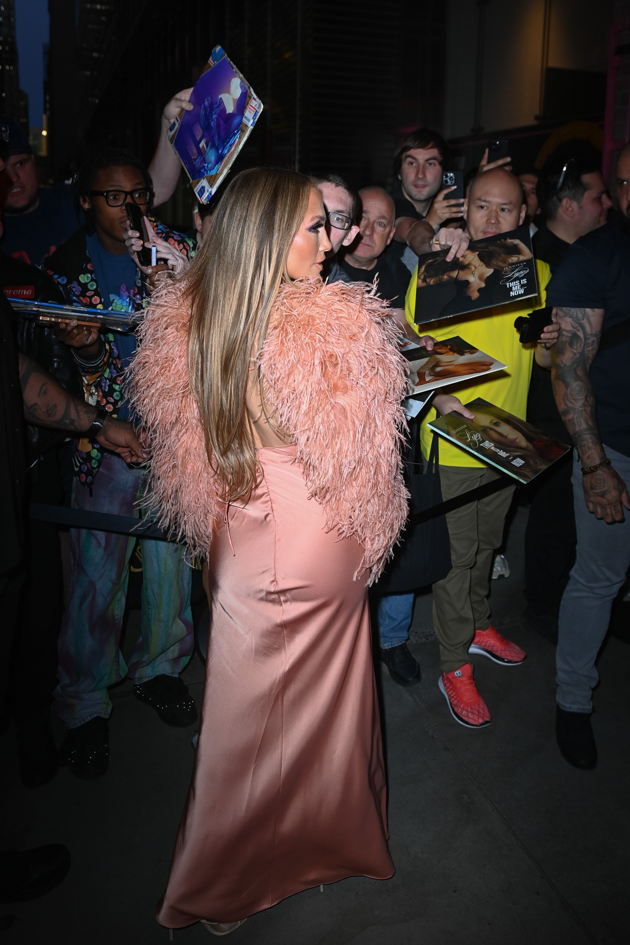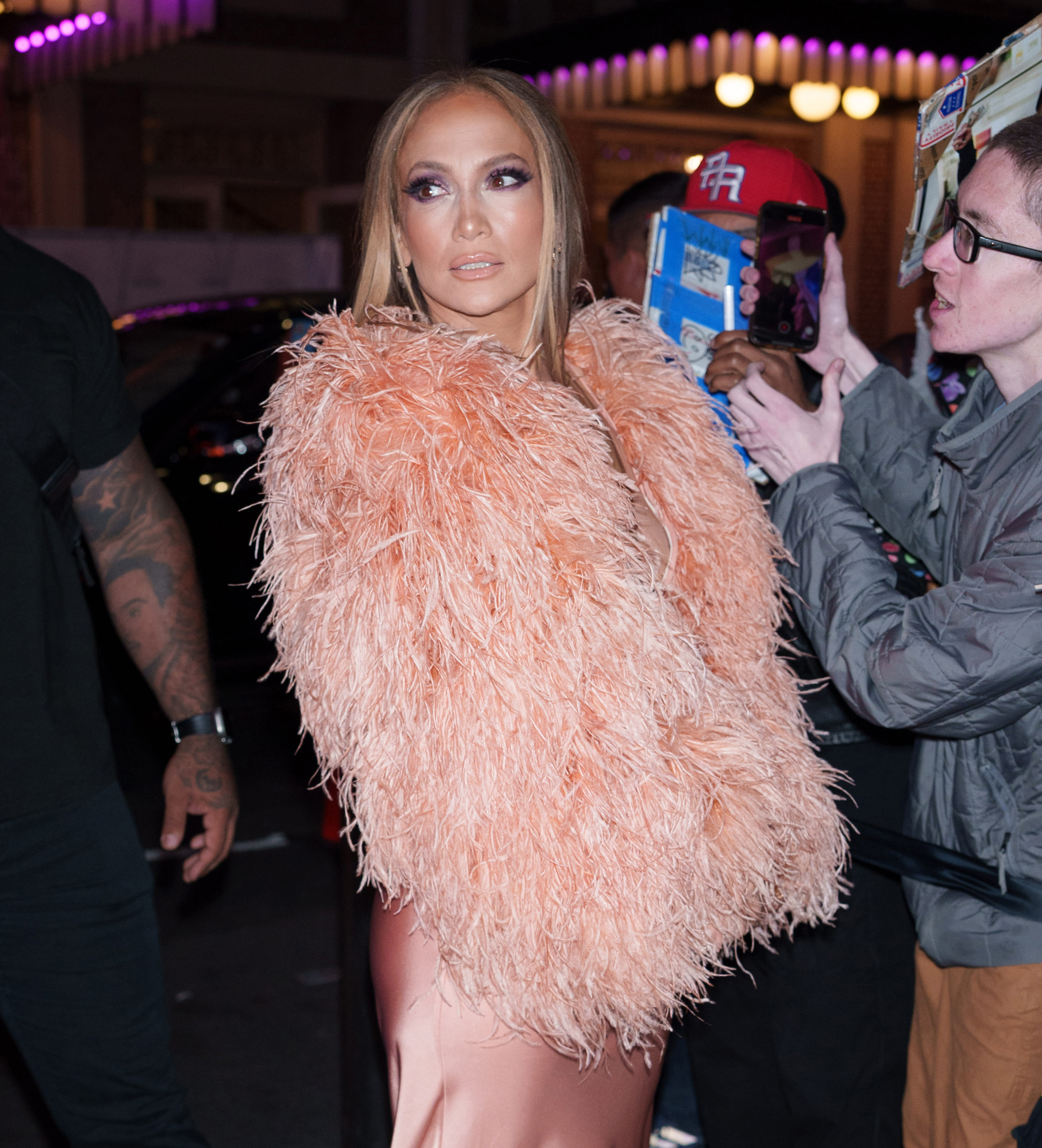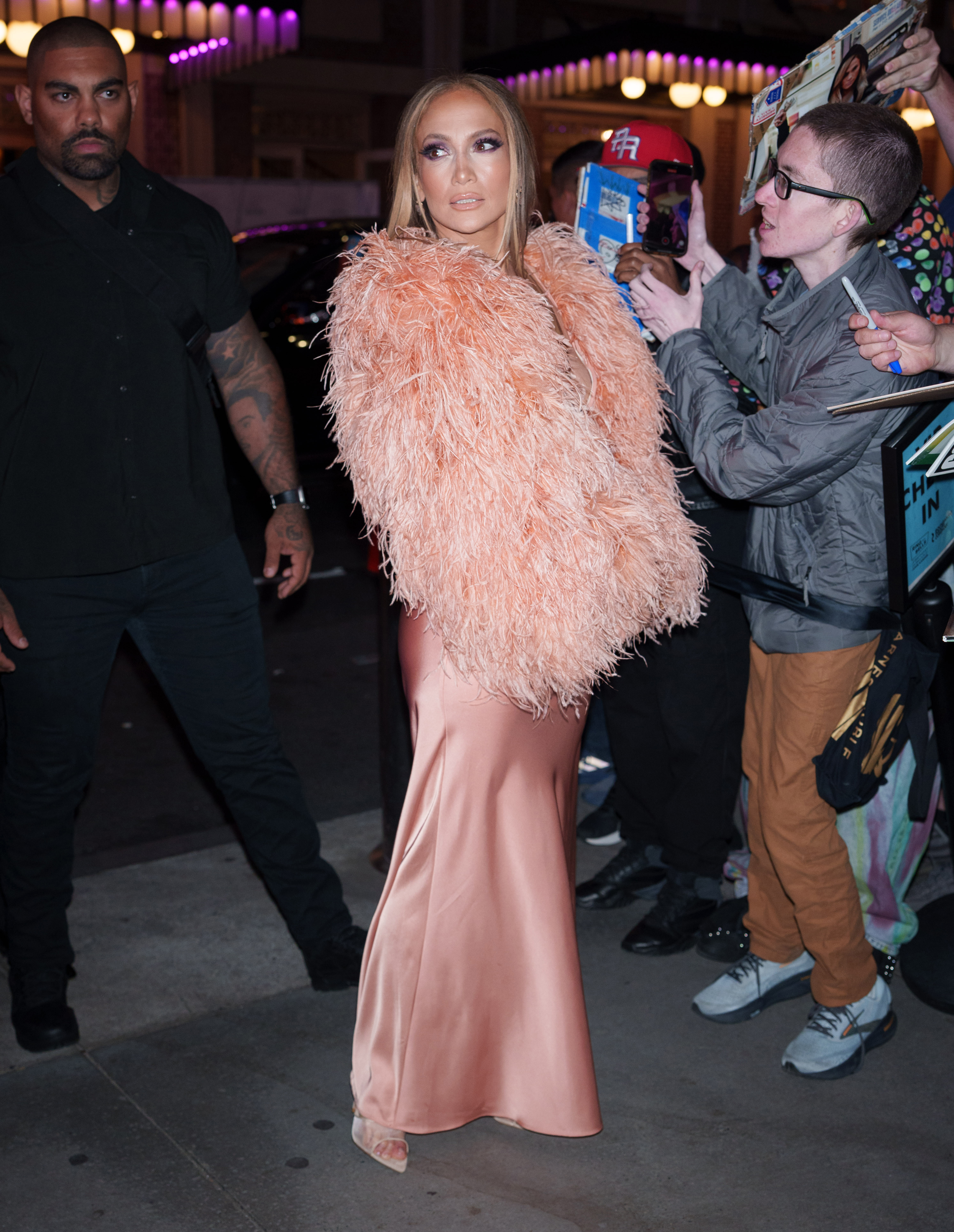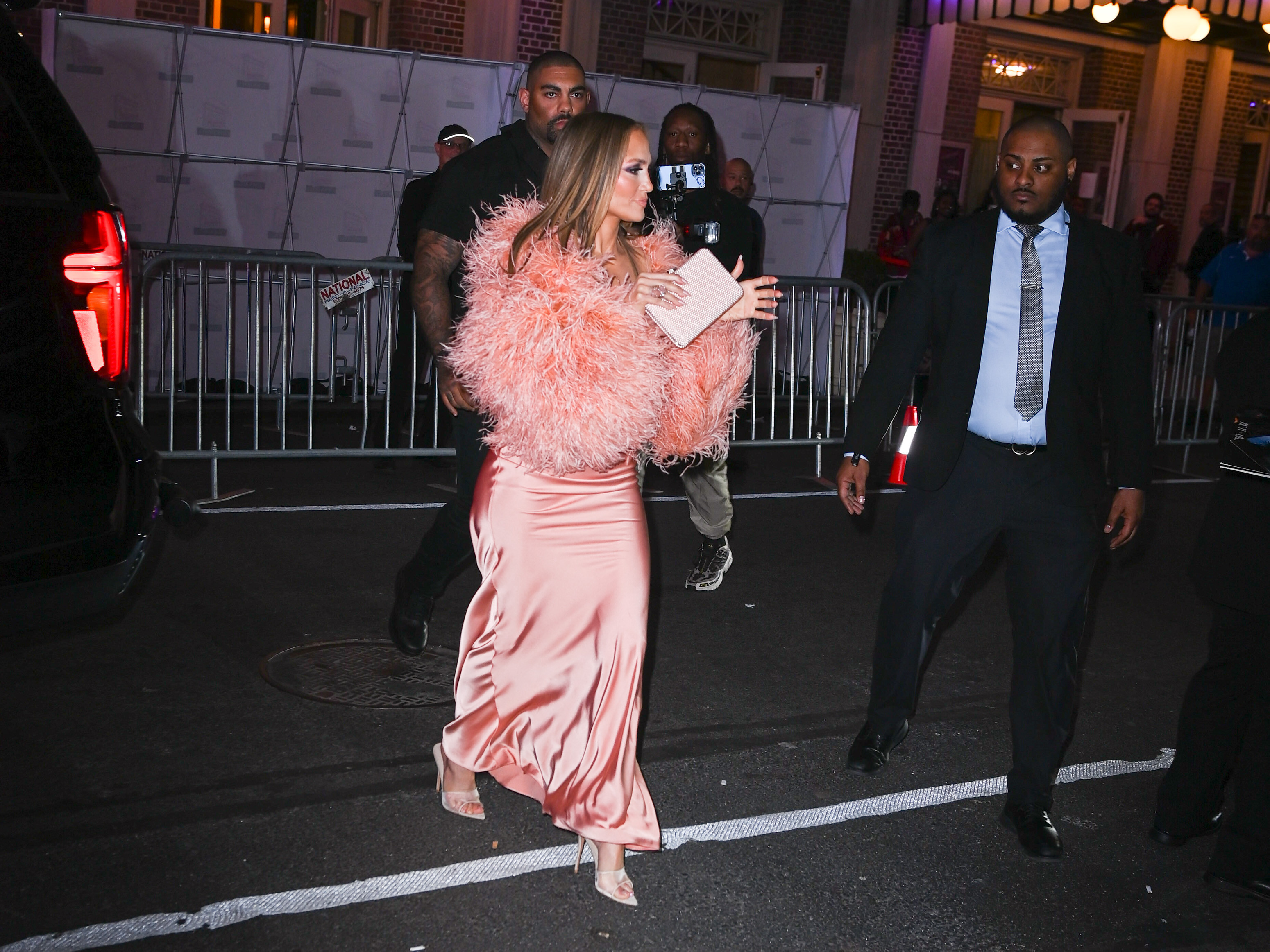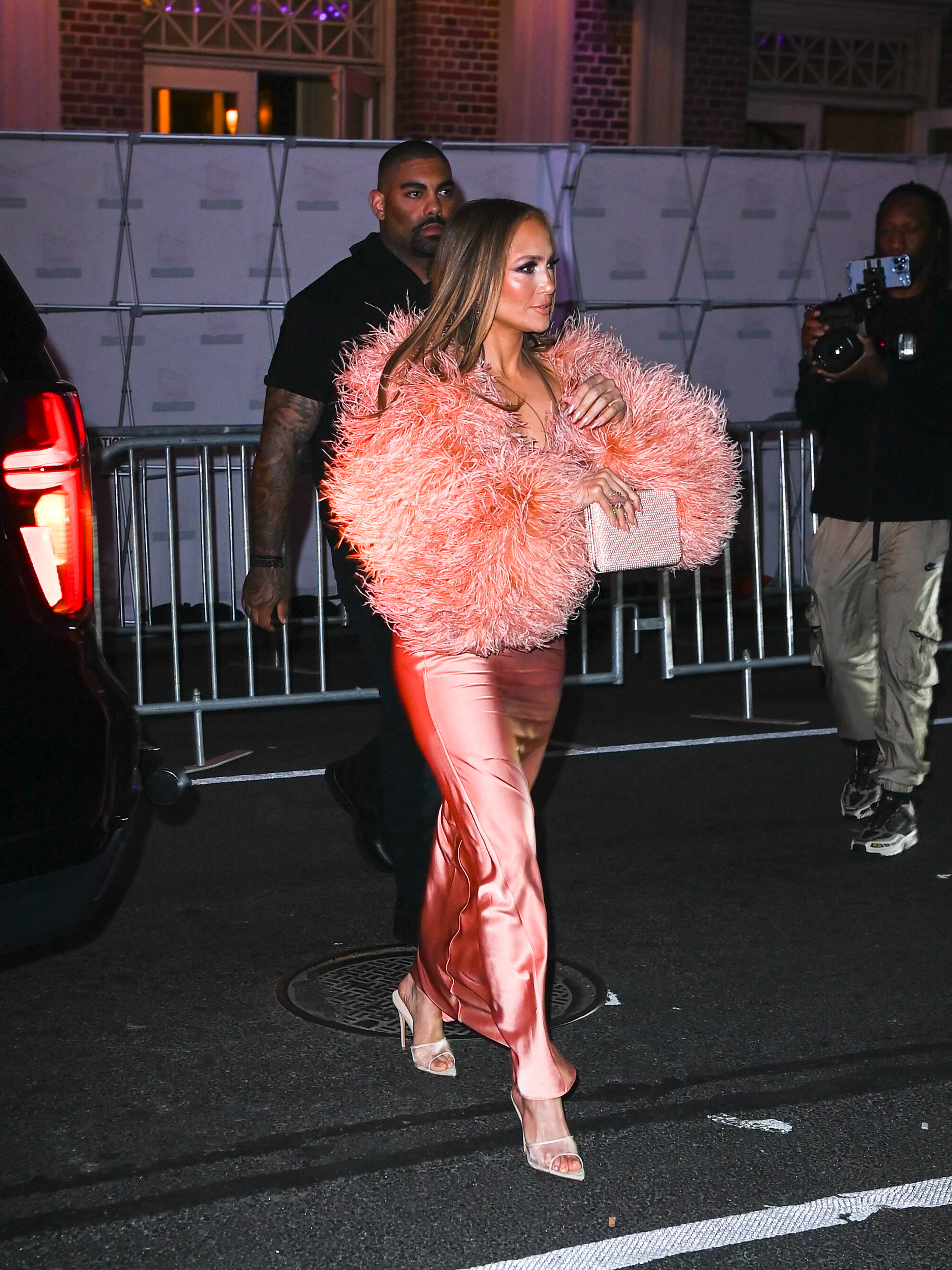 Jennifer Lopez și-a început seara la un concert caritabil dedicat lui Kander, organizat la Stephen Sondheim Theatre din New York. Artista a ales o rochie vaporoasă, în nuanțe piersicii, cu detalii din pene, completată de un clutch strălucitor cu pietre. Coafura a fost una clasică, potrivit elle.com.