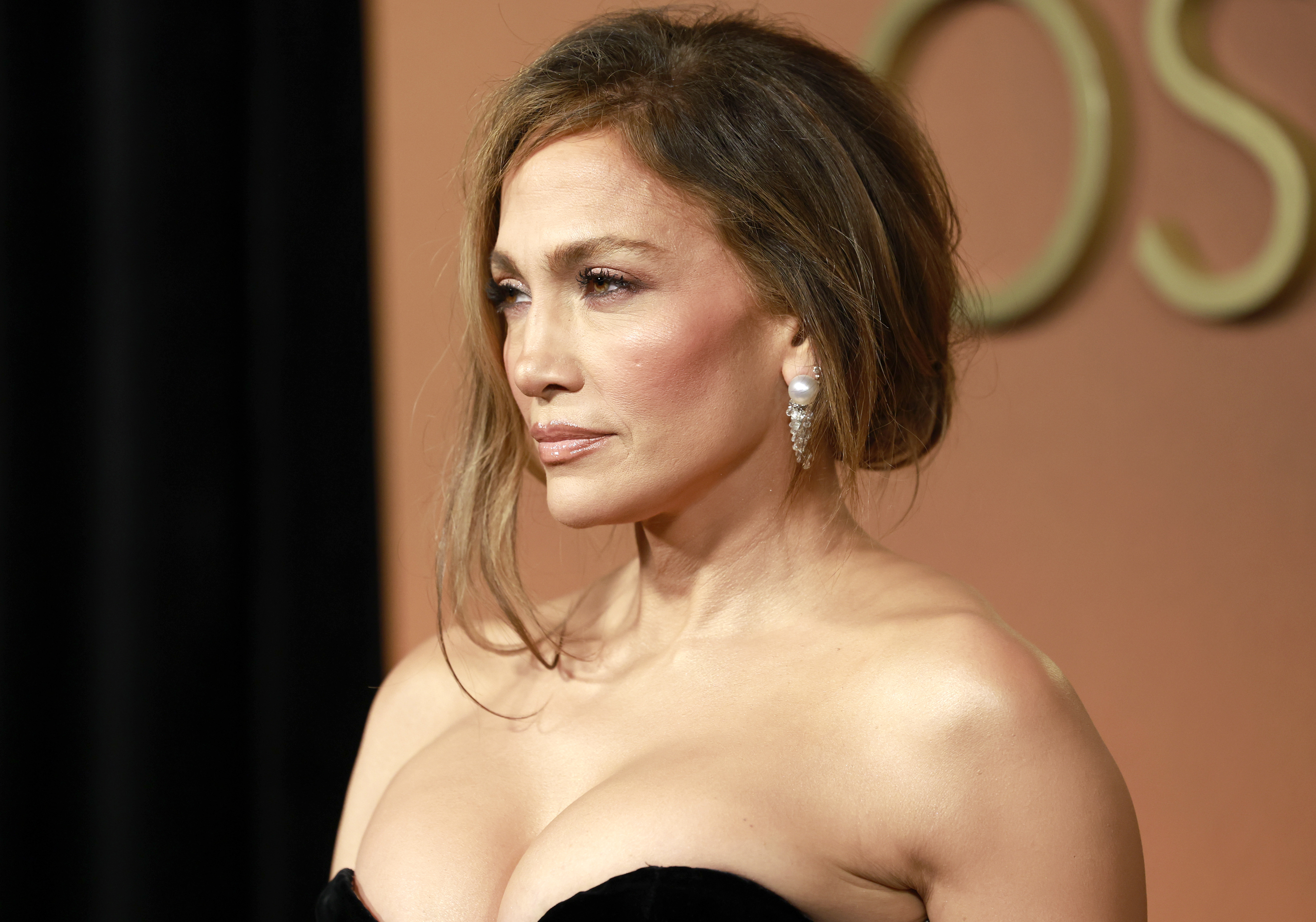 JLo și-a purtat părul blond într-un coc lejer, cu câteva șuvițe desprinse pentru a-i încadra fața. A accesorizat ținuta cu cercei lungi, cu perle și diamante. Cel mai recent film al lui Jennifer lansat în cinematografe este Kiss of the Spider Woman, apărut pe 10 octombrie.