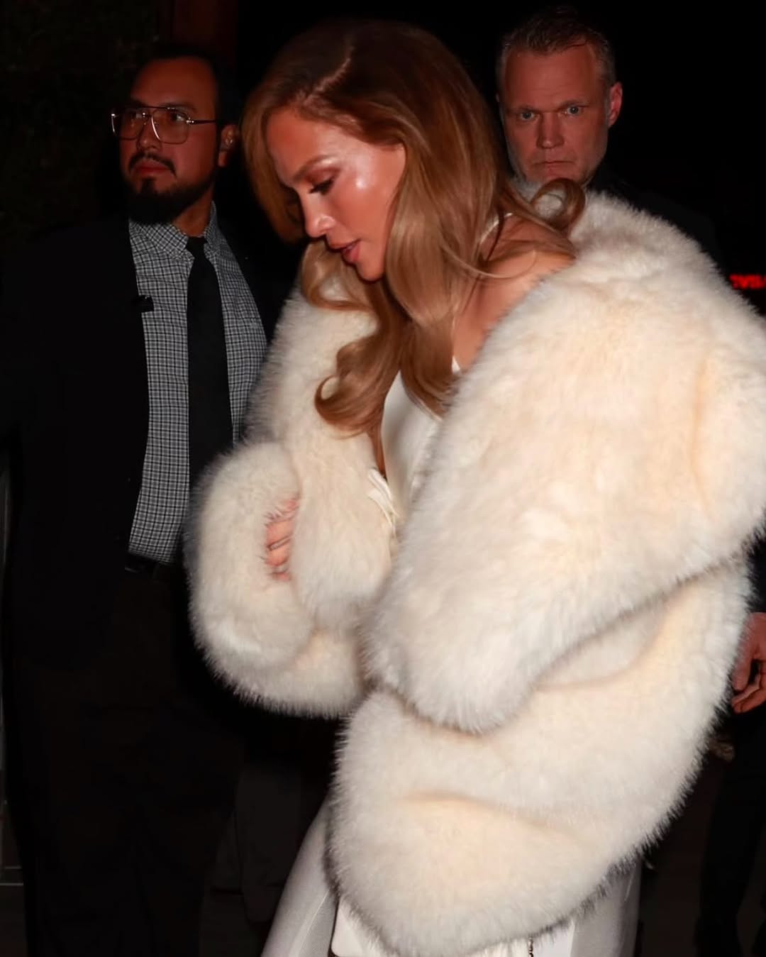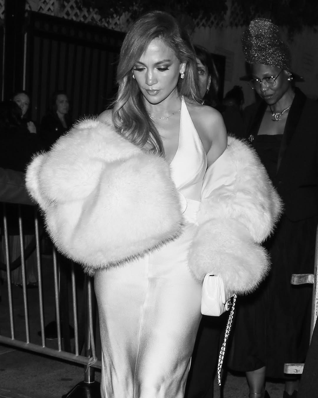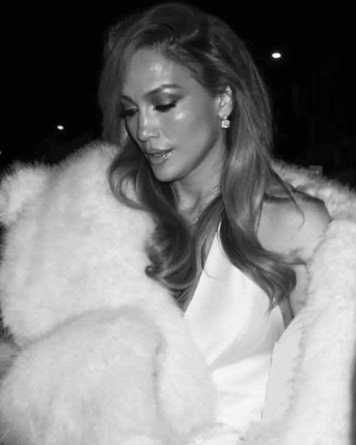 Pentru această seară specială, Lopez a ales o rochie albă din mătase, cu un decolteu adânc, care i-a evidențiat perfect silueta. Eleganța ținutei a fost completată de o șal din blană, purtat lejer pe umeri, adăugând un aer sofisticat întregului ansamblu.