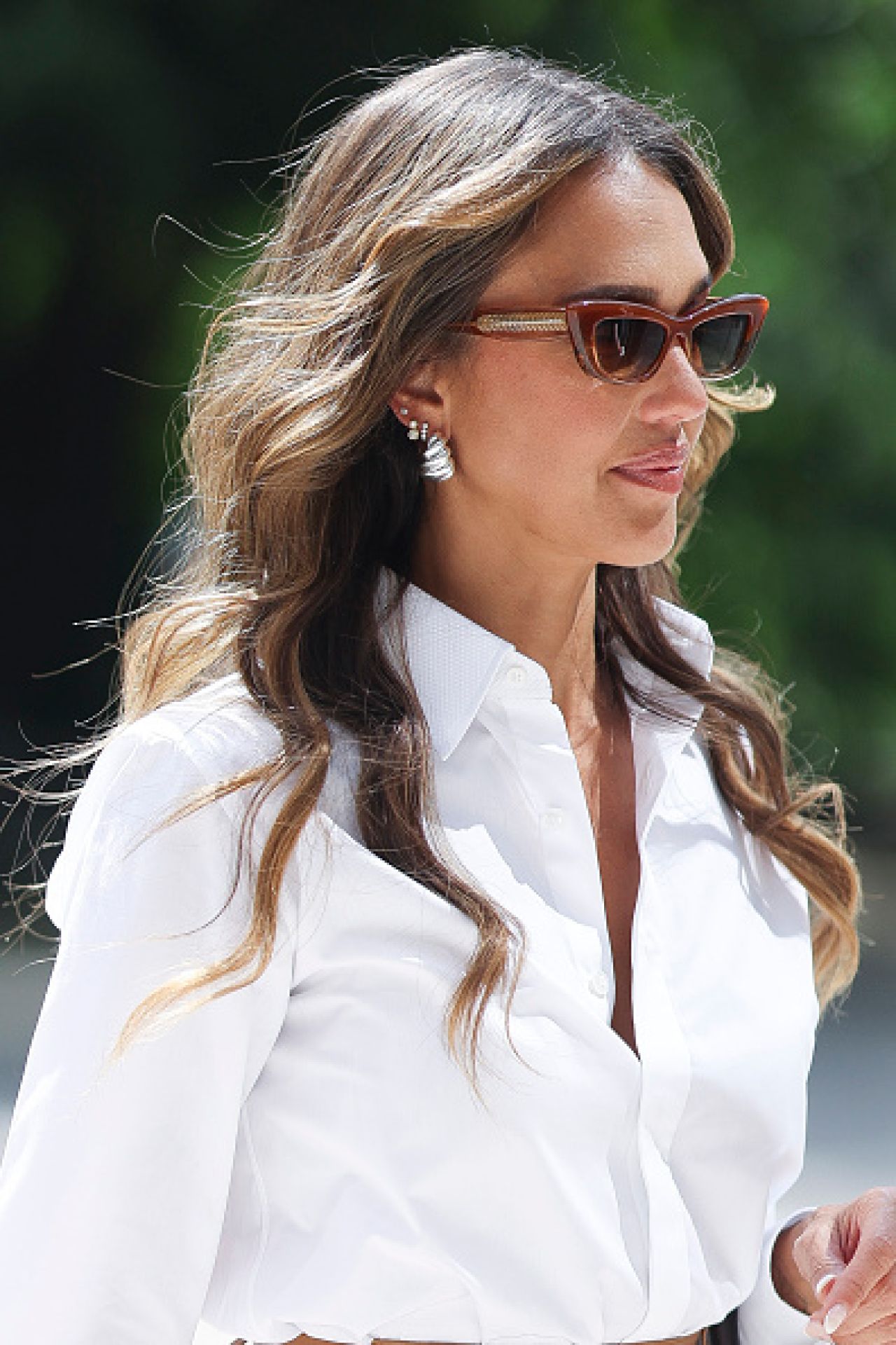 Ea și-a accesorizat ținuta cu un clutch din aceeași colecție, cea de primăvară 2026, semnată de același designer. Jessica, în vârstă de 44 de ani, a completat look-ul cu pantofi albi eleganți, cercei discreți și o pereche de ochelari de soare cu rame negre, în formă dreptunghiulară. Coafura elegantă și machiajul i-au oferit Jessicăi un look proaspăt și rafinat.