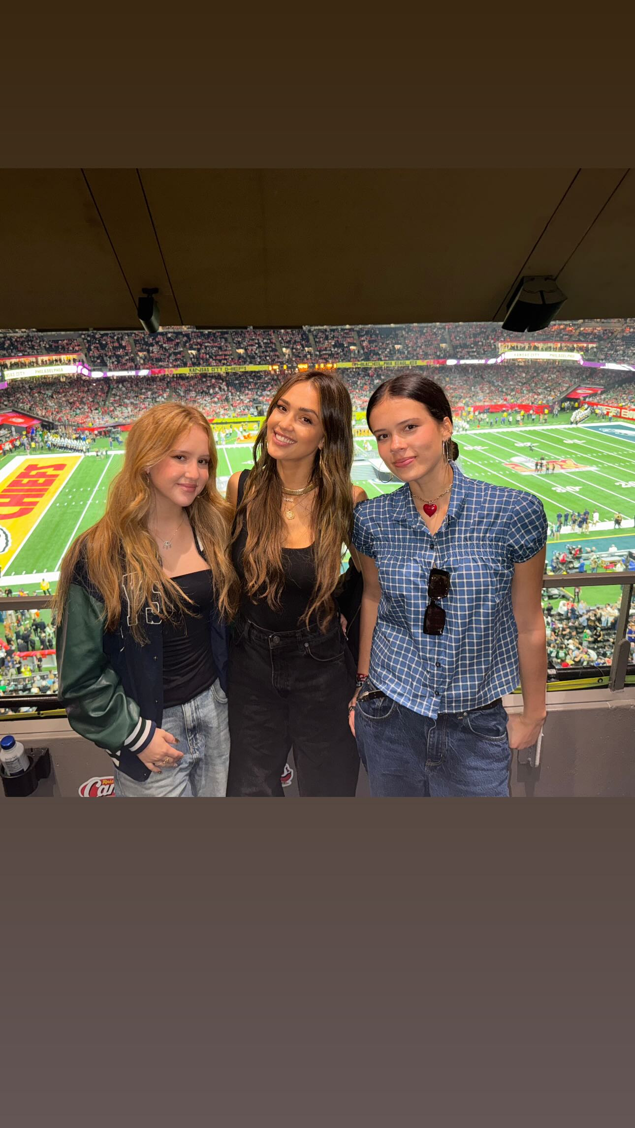 Actrița a scris pe rețelele sociale „Weekend pentru fete” în timp ce posta un selfie cu cele două fiice ale ei înainte de marele meci și a postat o poza și cu copiii ei din suita VIP de la Caesars Superdome din New Orleans.