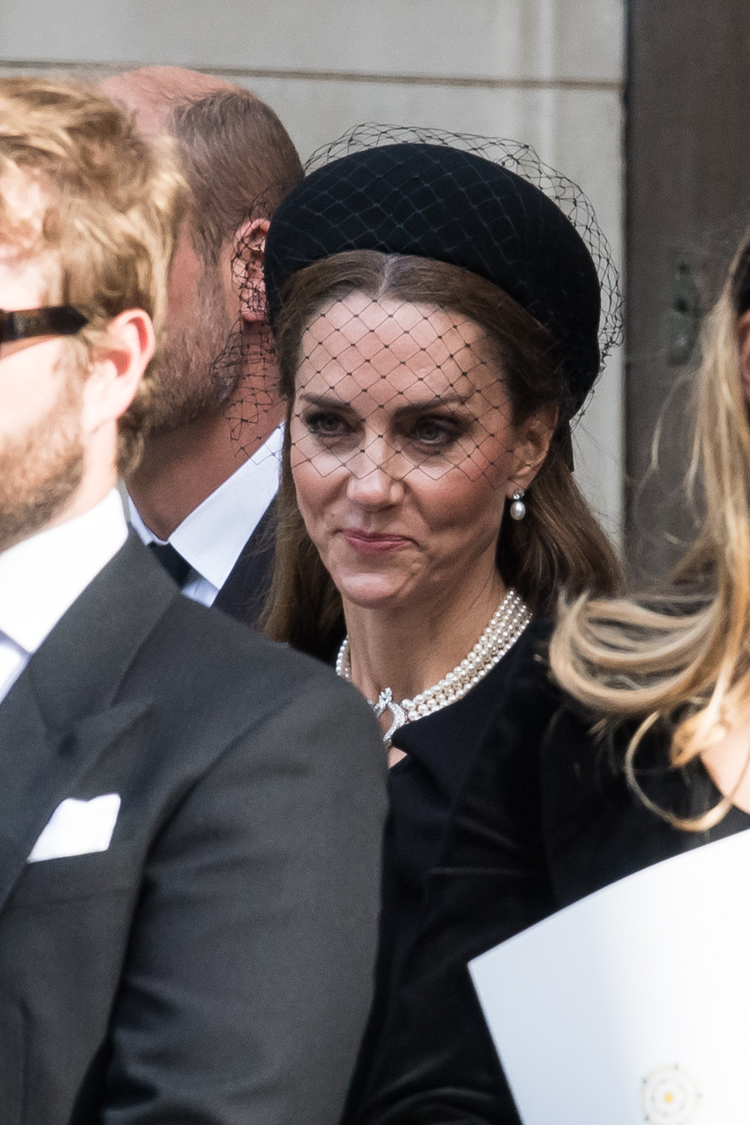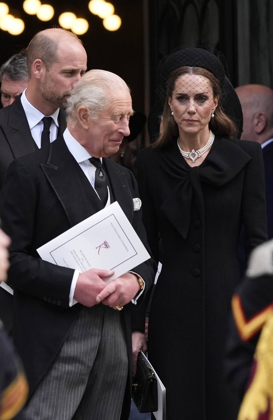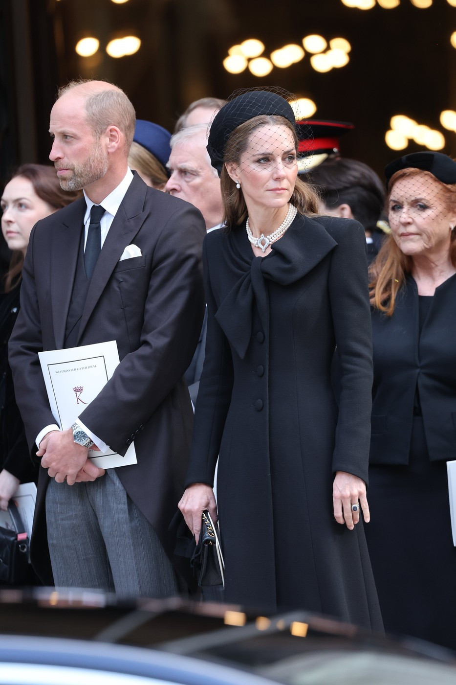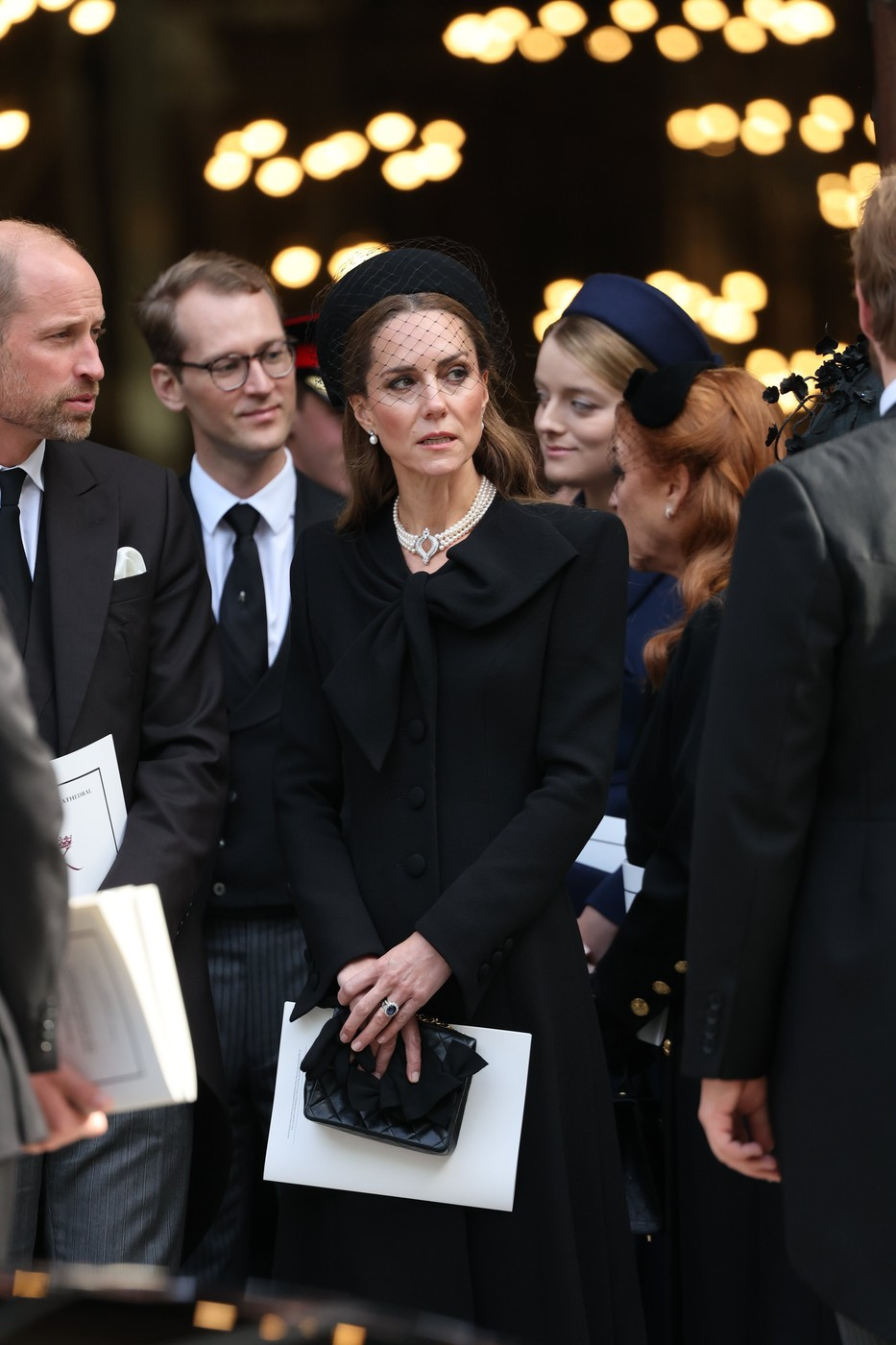 Kate Middleton s-a remarcat prin eleganța alegerii sale vestimentare la ceremonia funerară. Prințesa de Wales a purtat o rochie neagră clasică, completată de un colier cu patru șiraguri de perle, accesorizat cu o încuietoare centrală din diamant – o bijuterie cu istorie, ce a aparținut reginei Elisabeta a II-a. Piesa deosebită a fost purtată de Kate și la alte momente solemne din trecut, precum funeraliile reginei Elisabeta din 2022 și ale prințului Philip din 2021.