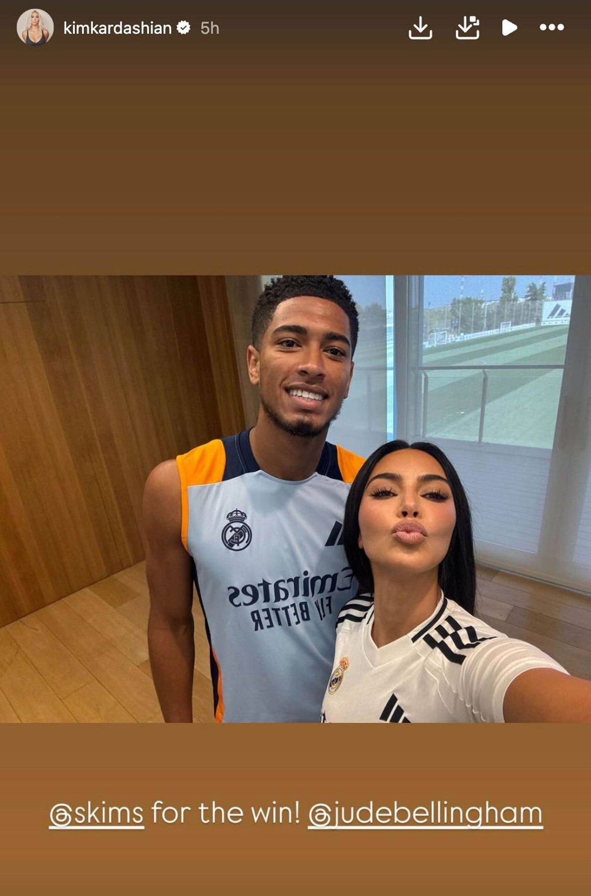 Vinicius Junior a împărtășit mai multe fotografii pe Instagram alături de Kim și de fiul ei, prin intermediul cărora îi mulțumește lui Kim pentru vizită. Postarea a adunat peste 3,2 milioane de aprecieri și peste 11.300 de comentarii.