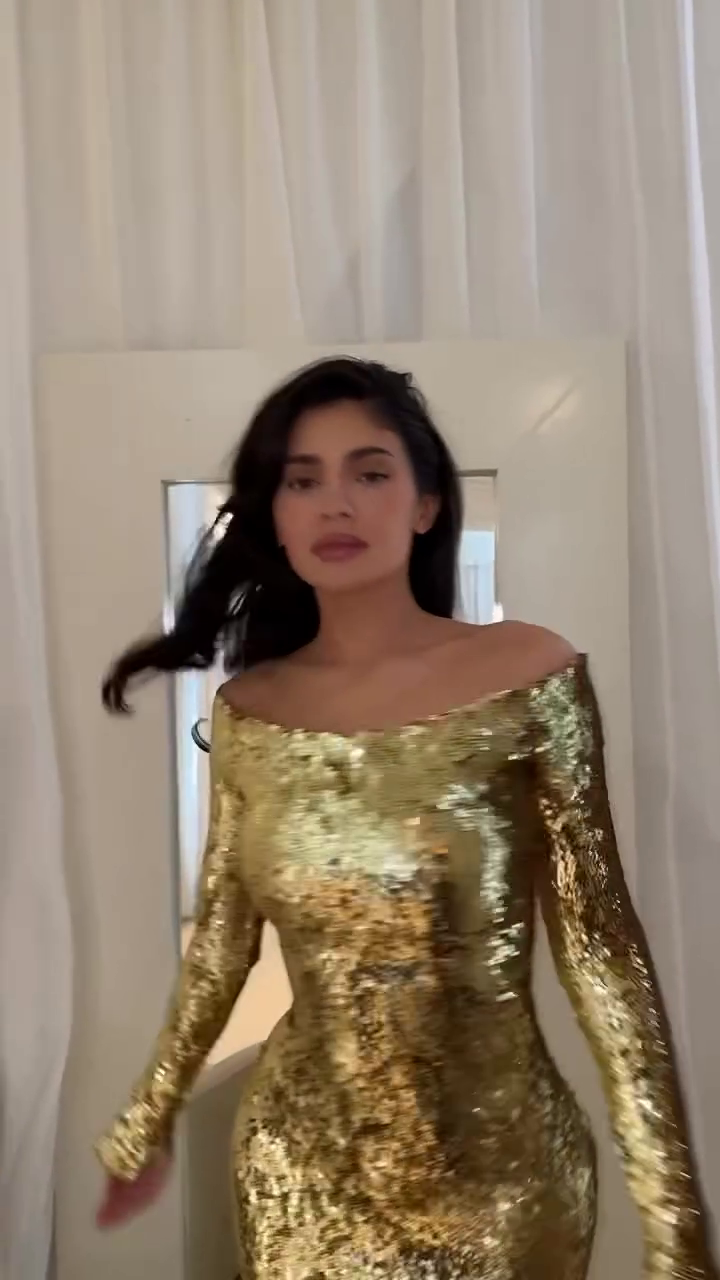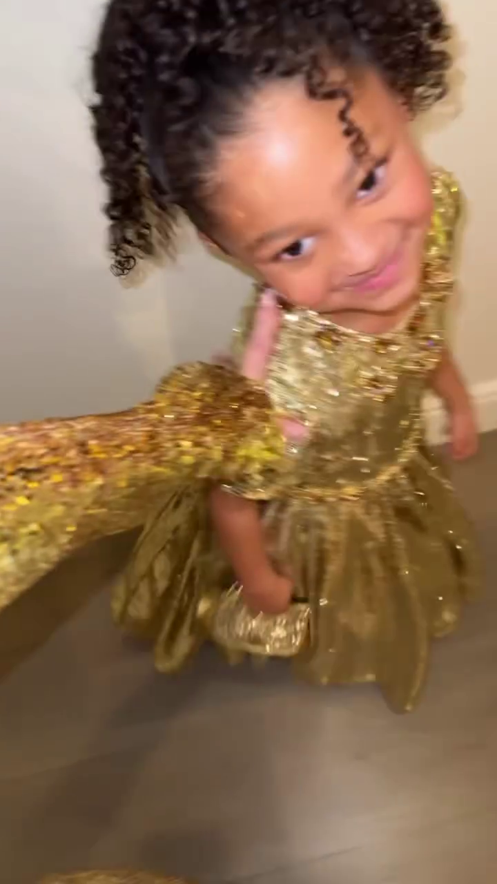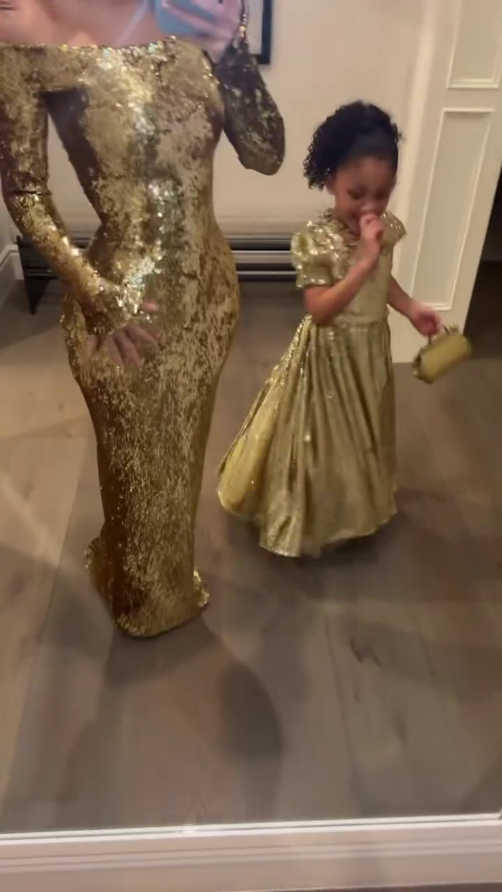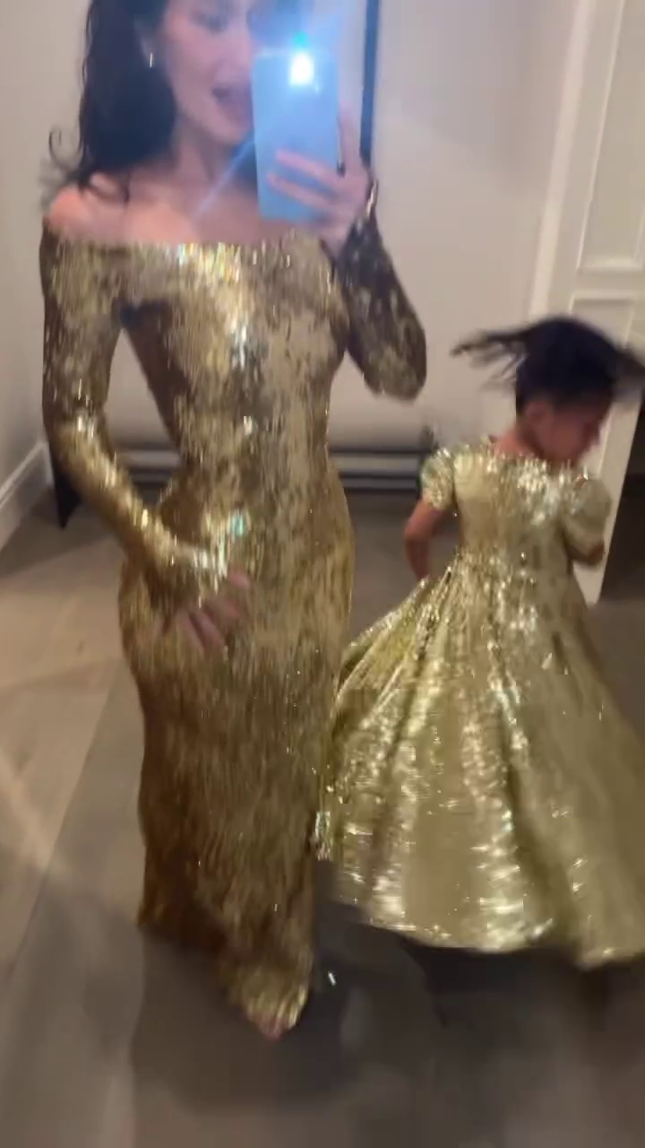 În timp ce a înregistrat momentul în care cele două se pregăteau pentru petrecere, Stormi făcea o piruetă și i-a amintit mamei ei că a uitat să-și pună pantofii.