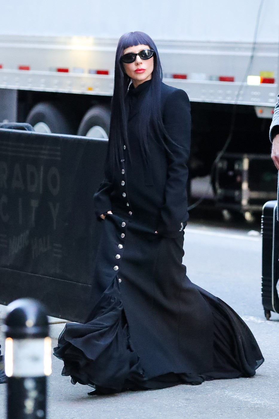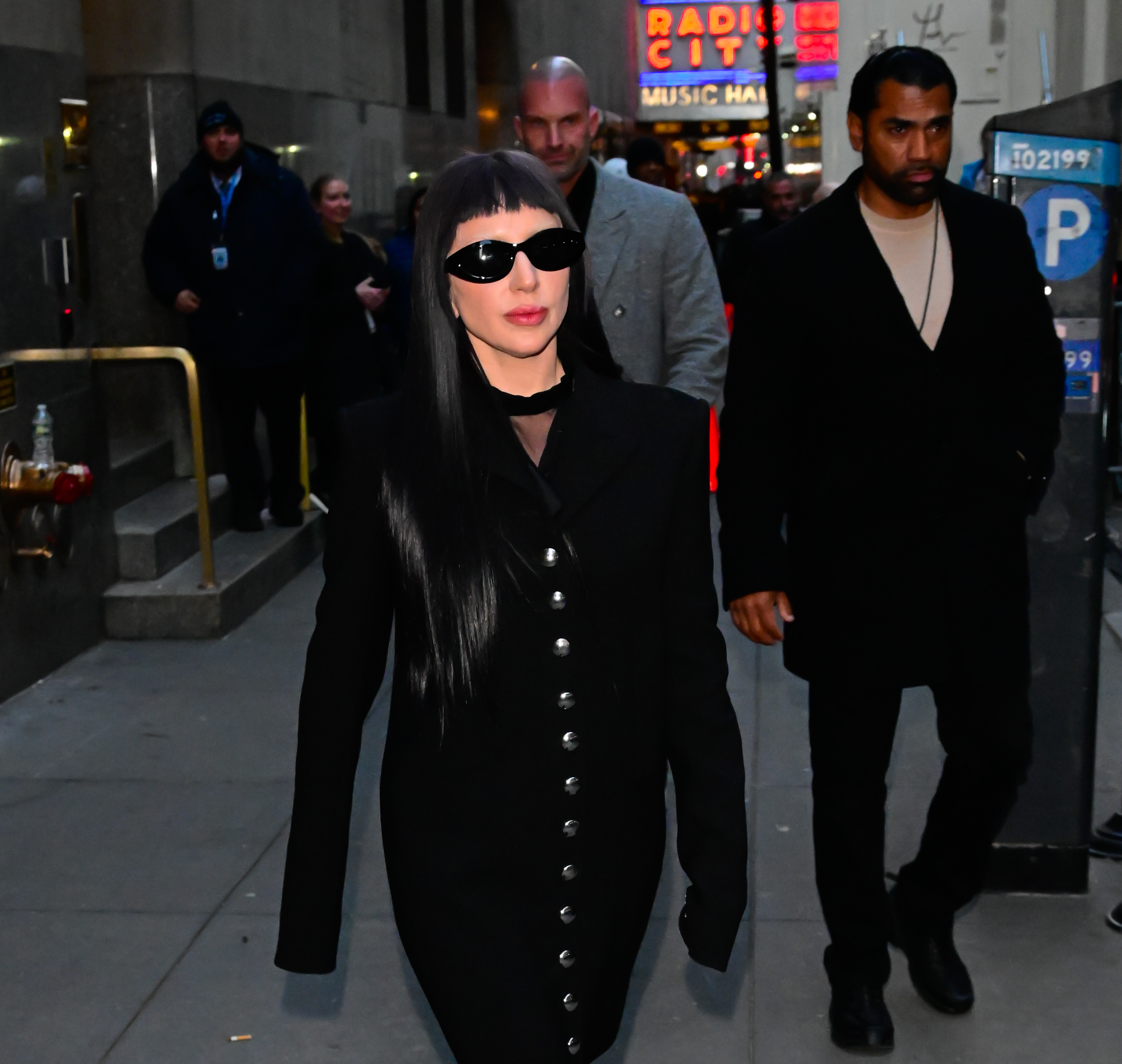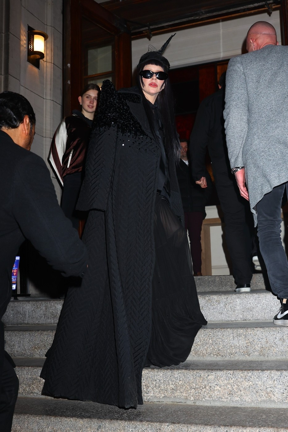 Și-a asortat look-ul cu noua culoare a părului, de un negru intens, care se potrivea perfect stilului ei goth-chic. Cântăreața a optat pentru o pereche de ochelari negri de soare ca și accesorii.