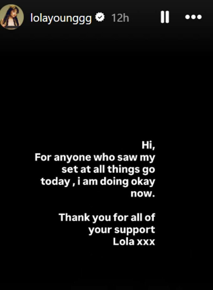 „Salut, pentru toţi cei care mi-au urmărit astăzi concertul de la All Things Go, mă simt OK acum. Vă mulţumesc pentru sprijinul acordat, Lola", a postat vedeta pe contul său de Instragram.