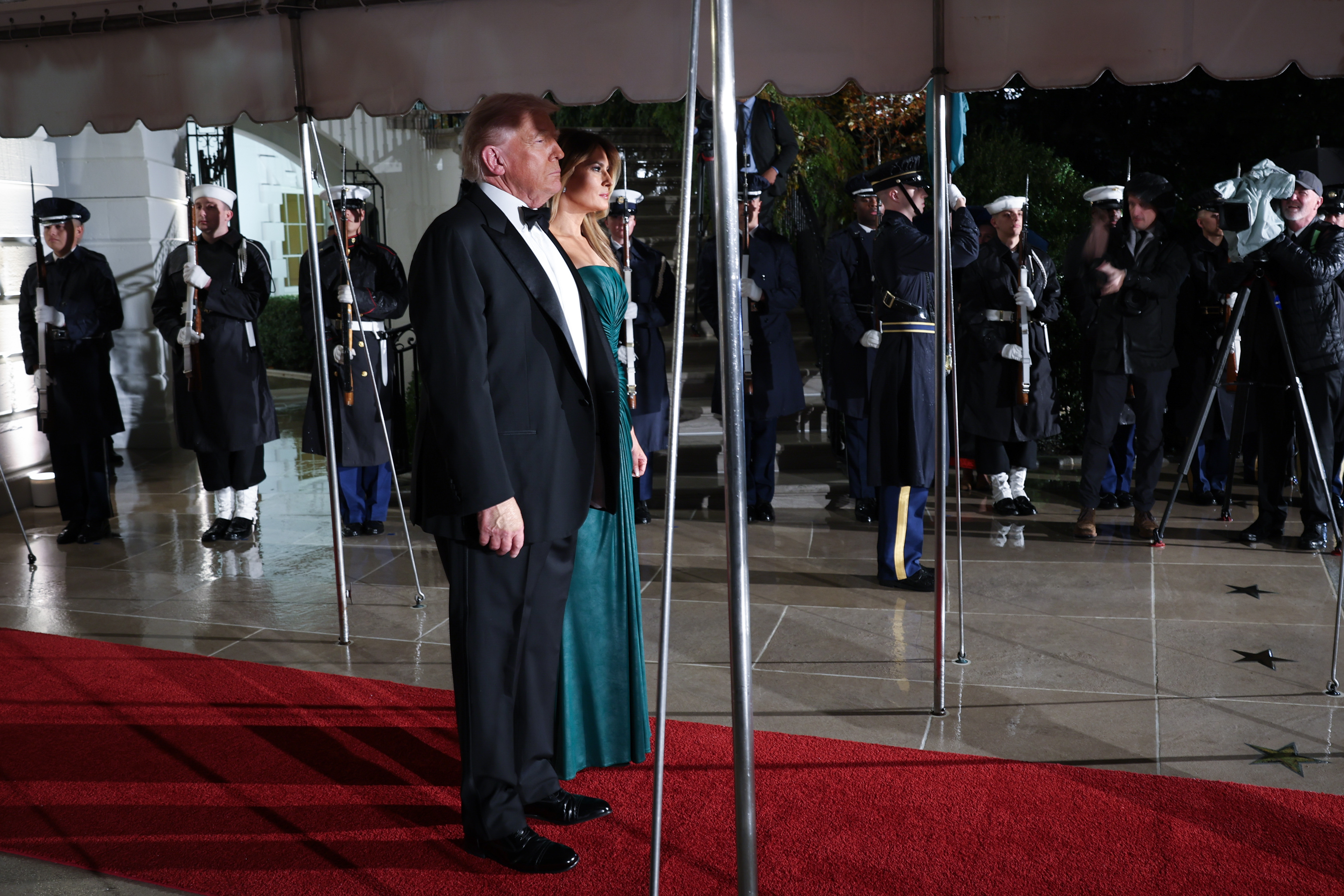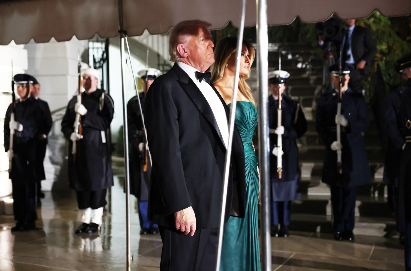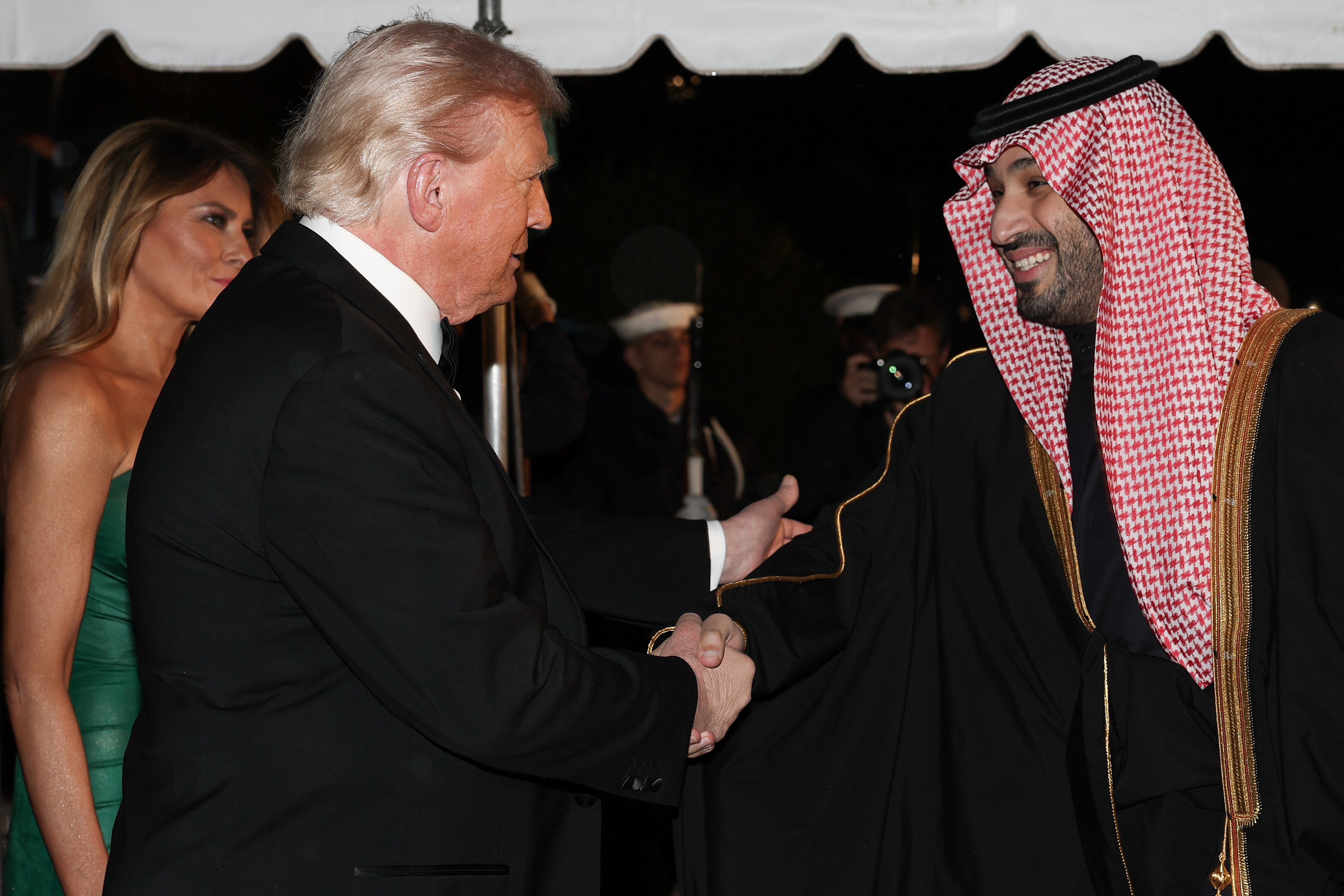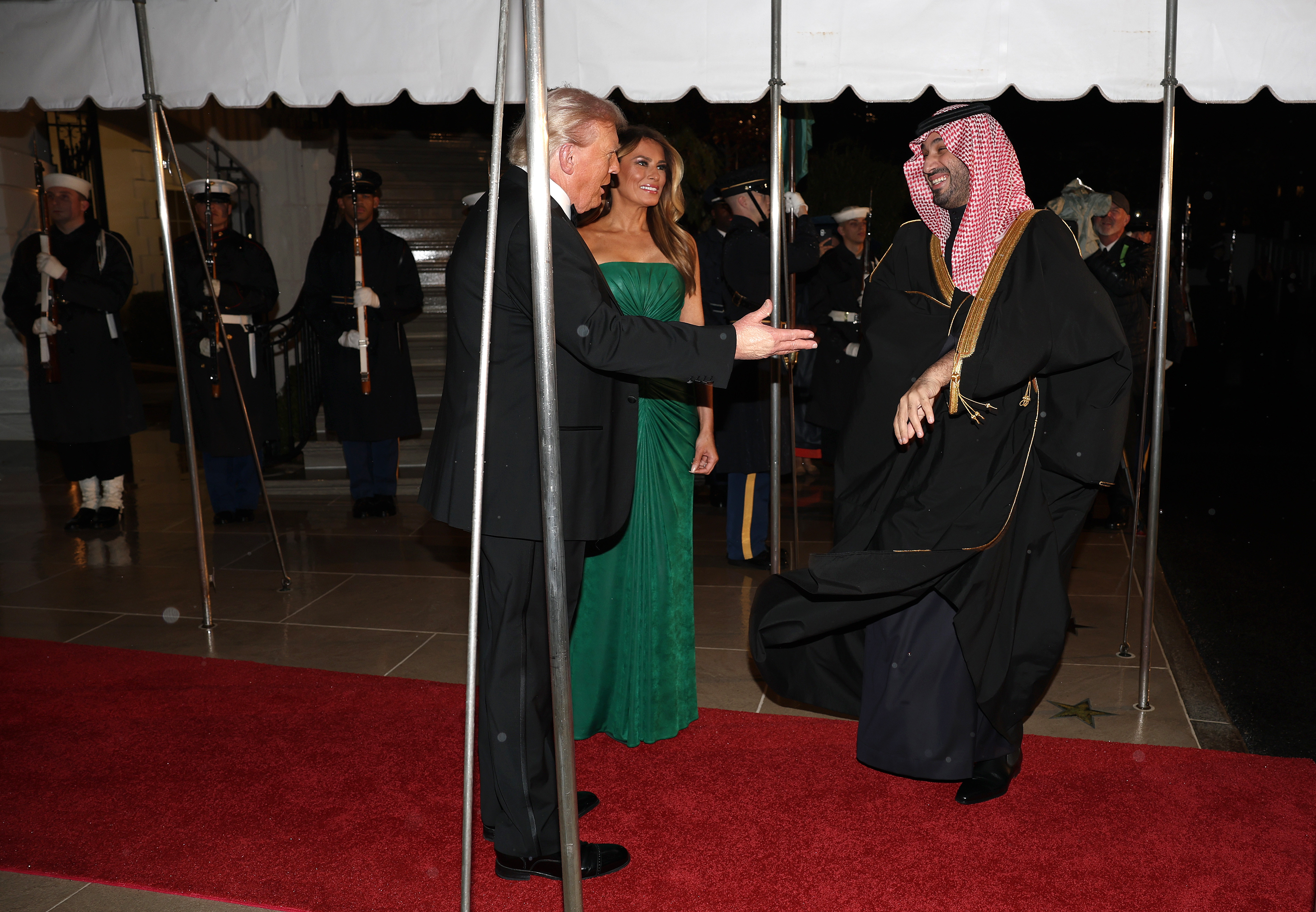 Vremea în Washington devenise rece și ploioasă, dar doamna Trump și-a păstrat eleganța, ținându-l de mână pe președinte în timp ce mașina neagră a lui MBS se apropia.