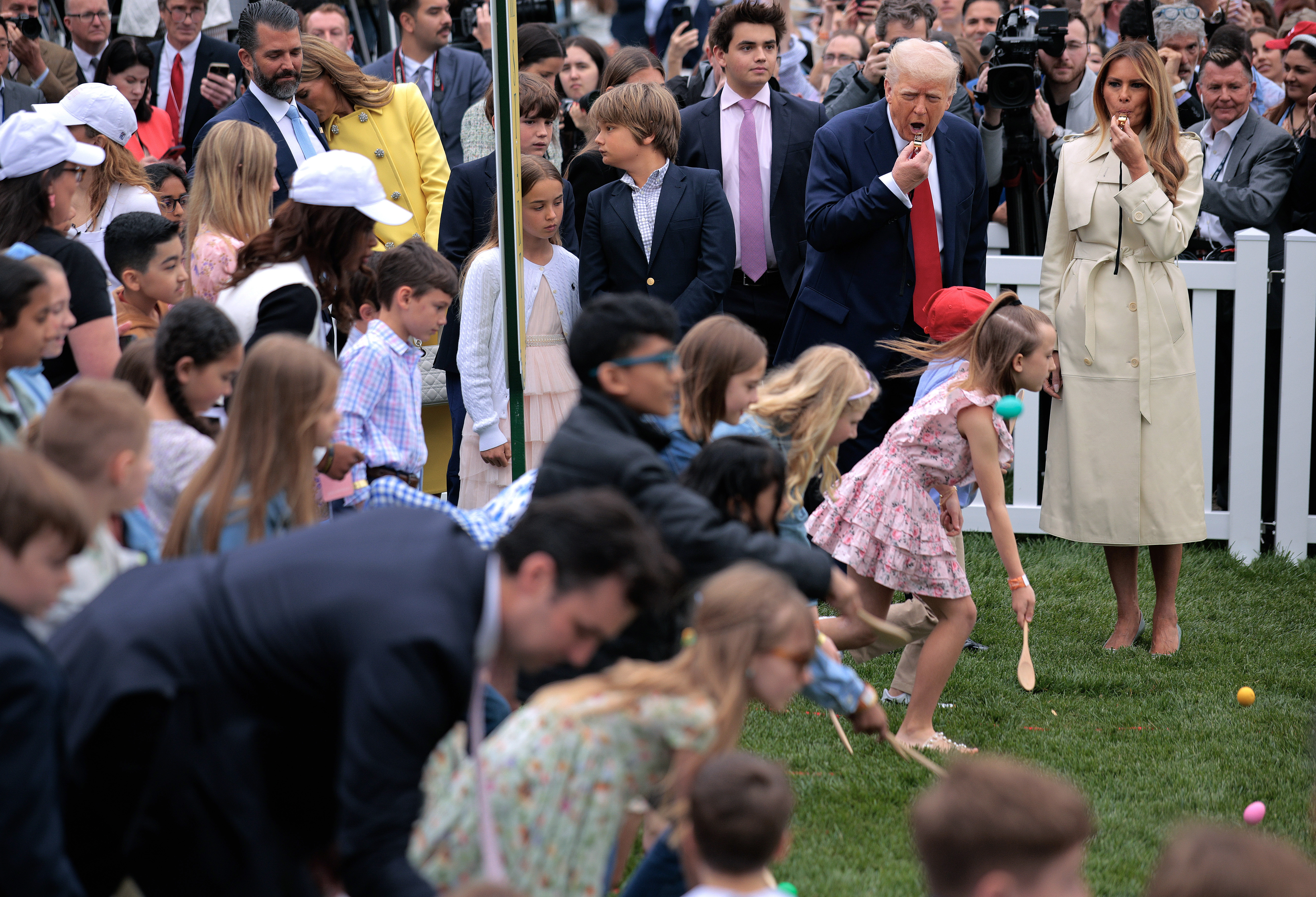 Melania, 54 de ani, și Donald, 78 de ani, au suflat simultan în fluier pentru a da startul tradiționalei competiții de rostogolire a ouălor.