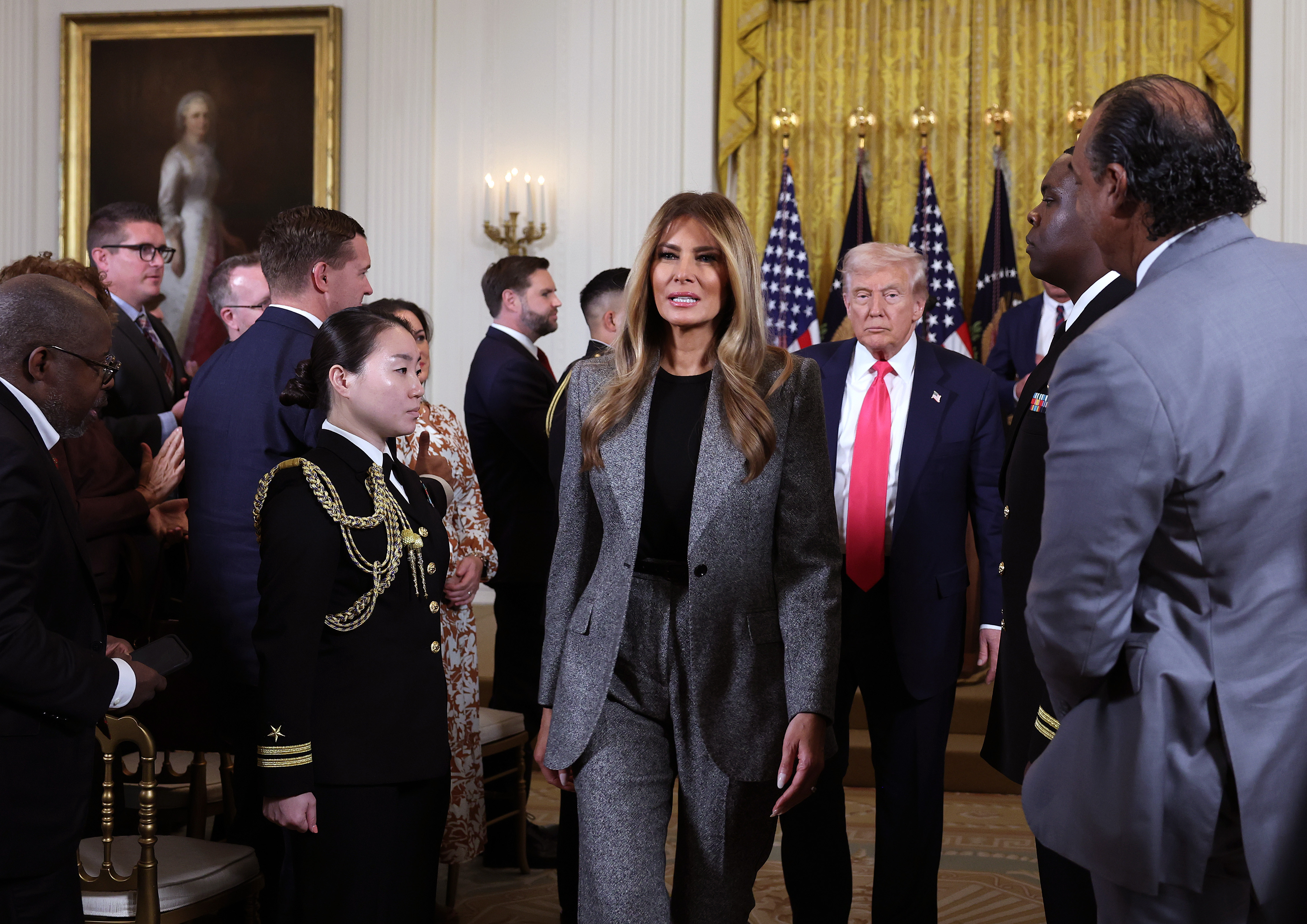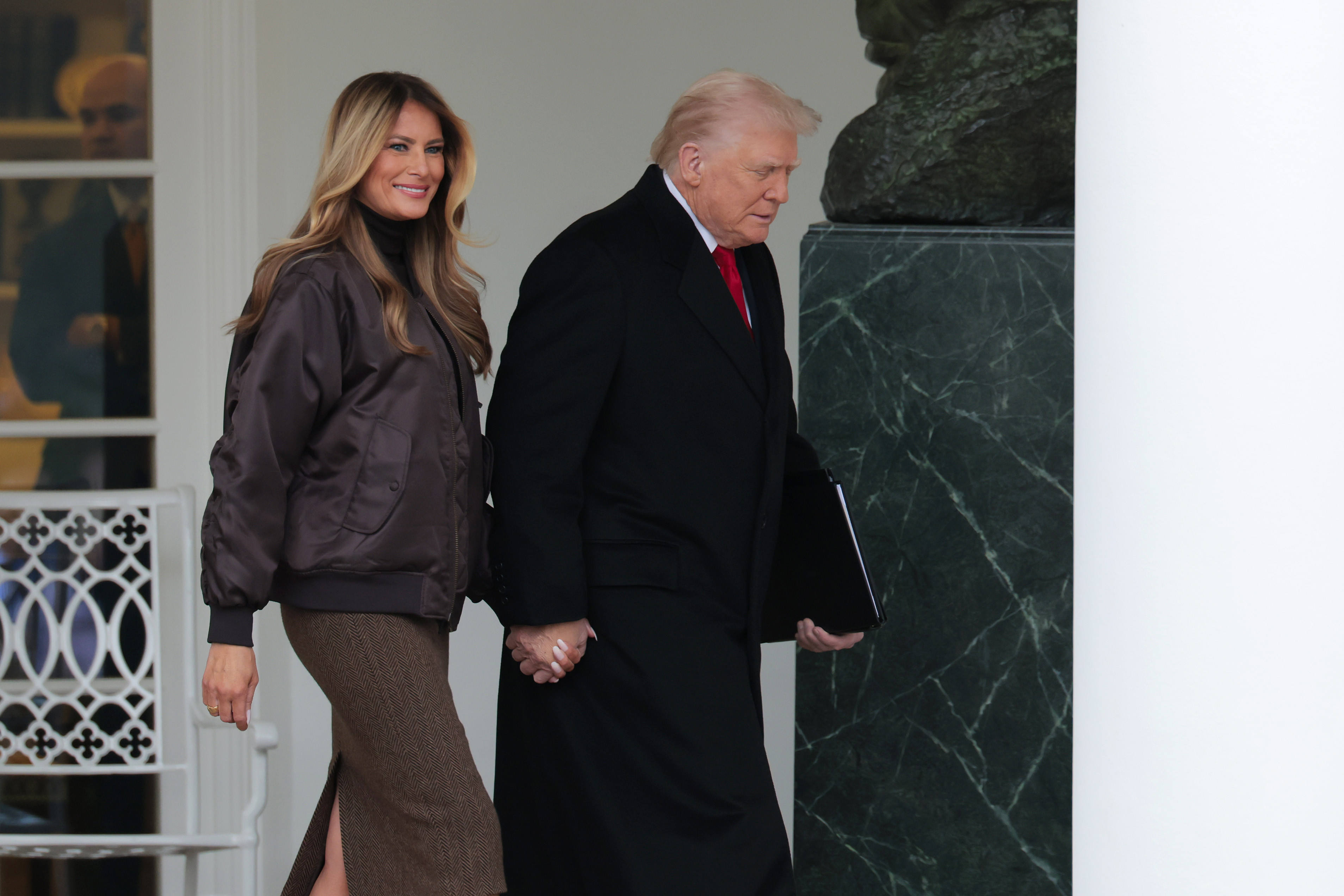 Melania Trump a purtat o fustă midi mulată, în nuanțe de maro, combinată cu o bluză neagră și o geacă scurtă, tip bomber, într-o culoare închisă, care adaugă un contrast modern și relaxat look-ului. Ținuta a fost completată de o pereche de pantofi stiletto asortați, într-o nuanță apropiată de cea a fustei, ceea ce a creat un efect vizual armonios și i-a pus în evidență silueta.